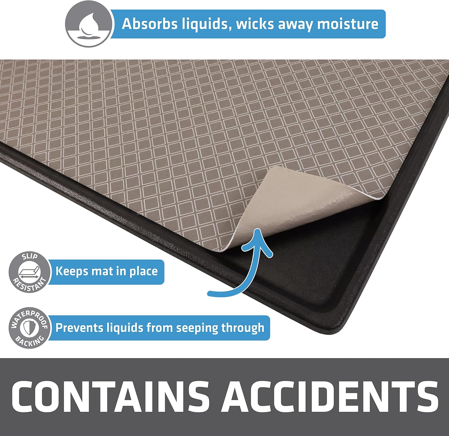 - CONTAINS ACCIDENTS & PROTECTS FLOORS: Drymate Dog Crate Mats are made with a thin yet absorbent material that contains urine inside kennels and provides a sure-footed surface for your pet’s paws (great for travel). Place under the crate to muffle sound and protect floors from scuffs and scratches. MULTI-USE: Can also be used as a reusable potty pad or cat litter mat.