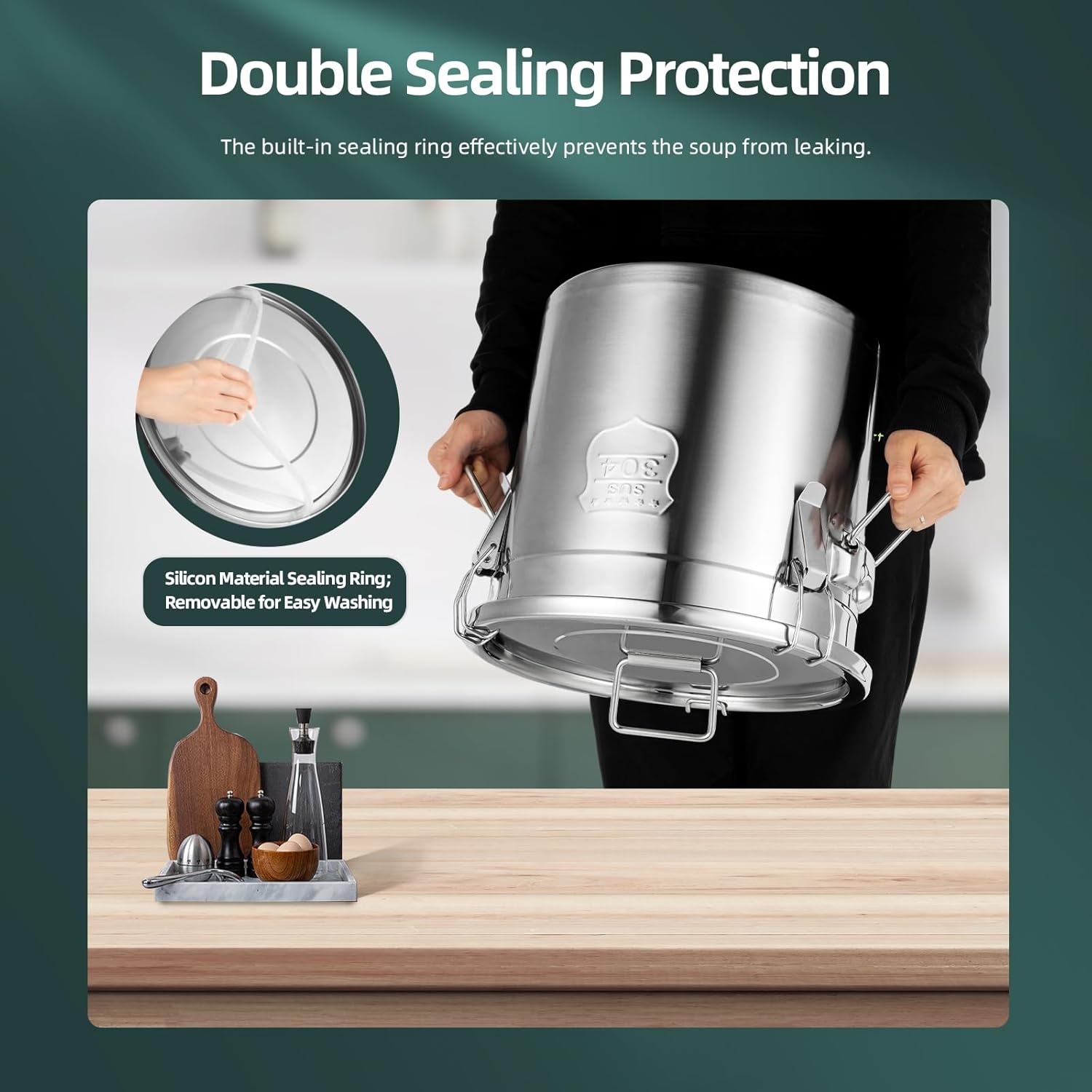 - Double Sealing Protection: Three strong sealing buckles firmly lock the bucket body and lid without gaps. The built-in anti-leakage sealing ring is highly sealed and effectively prevents the soup from leaking.