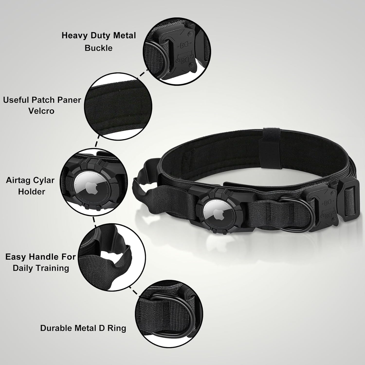 Tactical AirTag Dog Collar Leash Set - Heavy Duty, Adjustable GPS Collar Compatible with Apple AirTag, with Holder & Control Handle for Medium/Large Dogs [Black, XL]