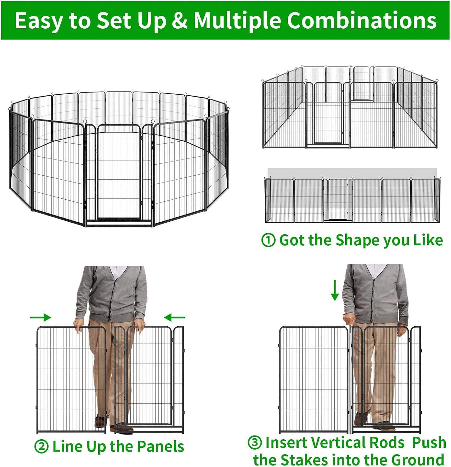 - 【Easy to Set Up & Multiple Combinations】The panels come with individual poles to connect them together, easy to set up or take it down in minutes, dog fence can do multiple combinations and configurations, dog playpen for the yard easily conforms to different shapes according to your garden or room, circle, polygon, irregular, etc
