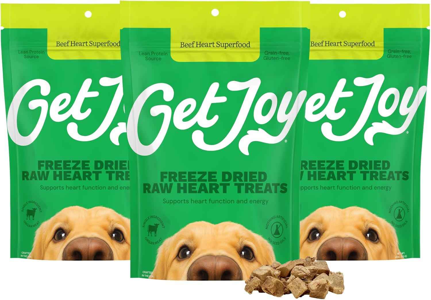 Get Joy Freeze Dried Superfood 100% Beef Heart Dog Treats, 4 Ounce Bag (Pack of 3), Single Ingredient Organ Meat, High Protein, Heart Health, Energy, Grain Free, Gluten Free, Made in USA