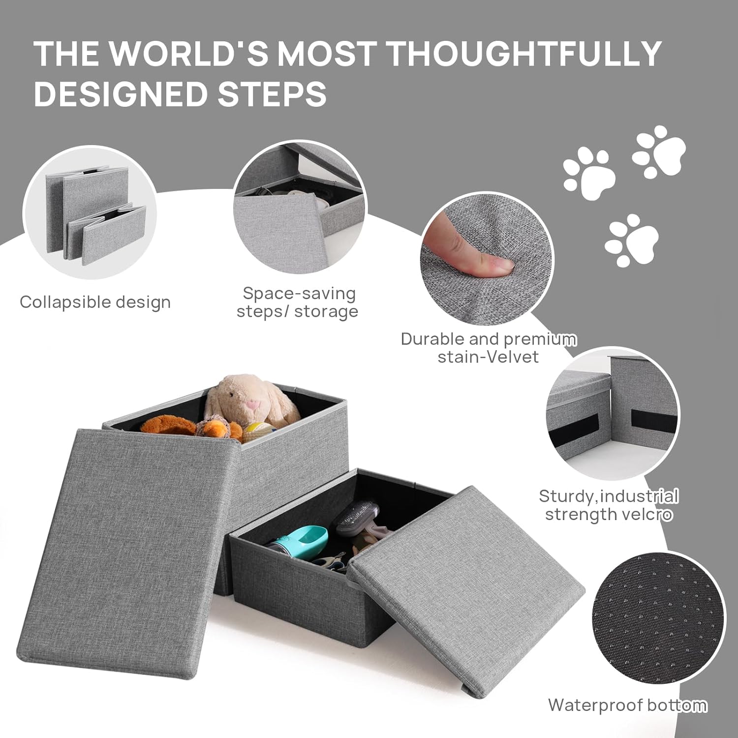 - Easy Assembly and Portable: You can put the foldable dog steps for a high bed together in 10 seconds. Lightweight and sturdy, these pet stairs can be easily moved, shifted, and stored for convenient accessibility. Pet steps fold flat so you can easily store them under your couch or bed.