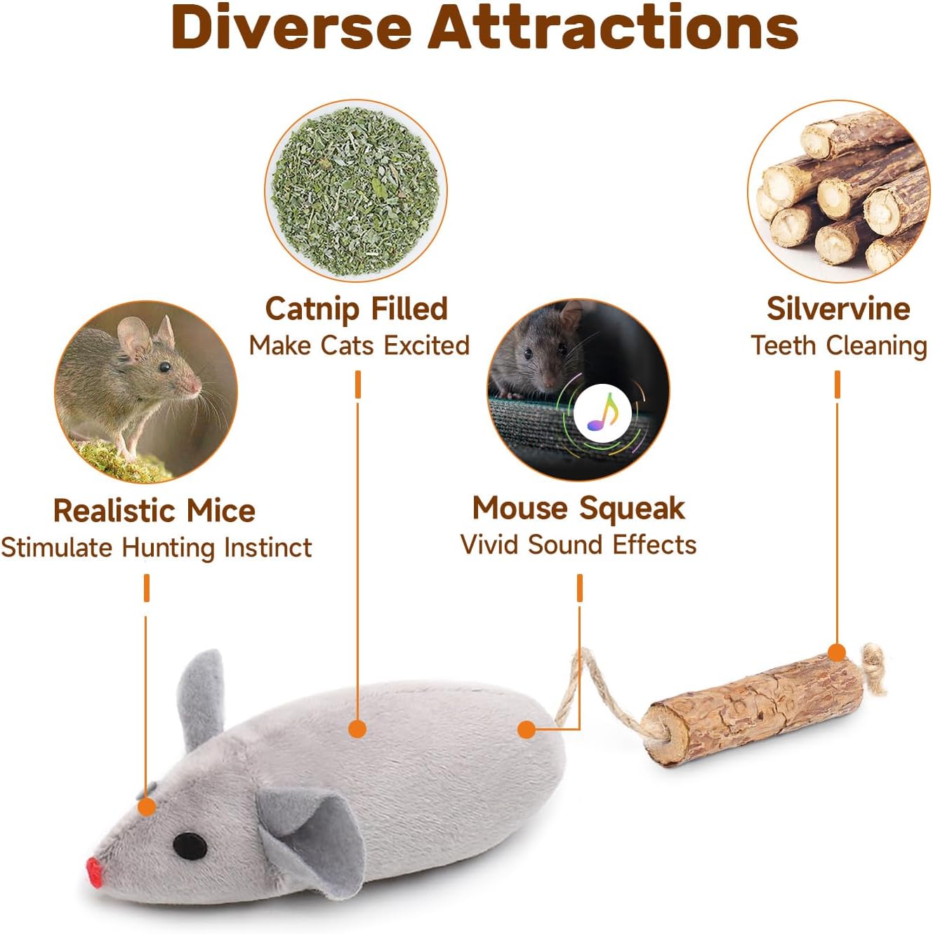 - Squeak Mice – Make play fantastic with the 3 plush squeaking mice toys. The cat toys make lifelike mouse chirping sounds once playtime begins, beckoning every bat, bite, chew, and chase! The mice kitten toys keep quiet when left alone to save battery power