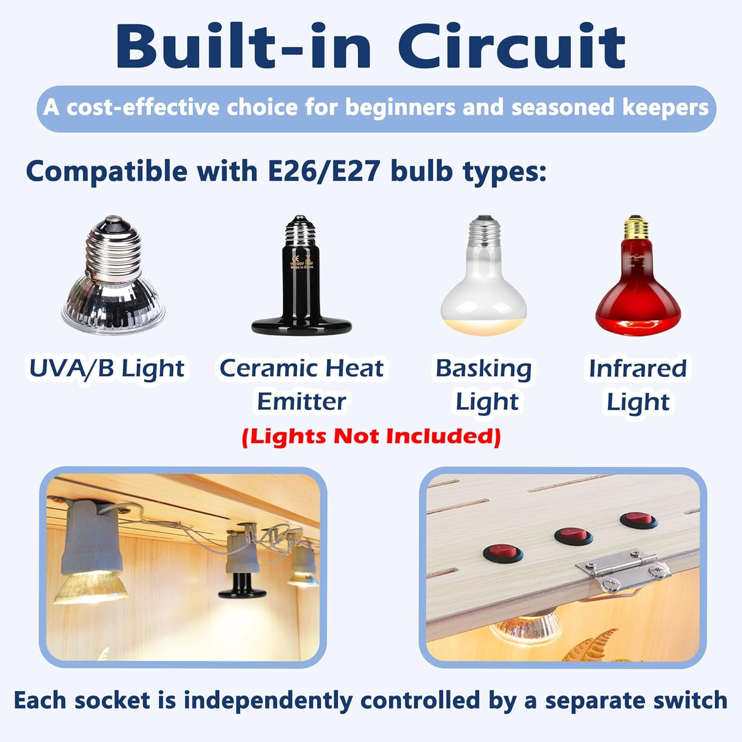 - ăConvenient Bulb SocketsăEquipped with built-in bulb sockets and switches (three in the 40/48-inch version), our terrarium accommodates various E27 bulbs for heating, lighting, and night illumination (bulbs not included). Installing the lights is a breeze, making it an ideal habitat for your reptiles.