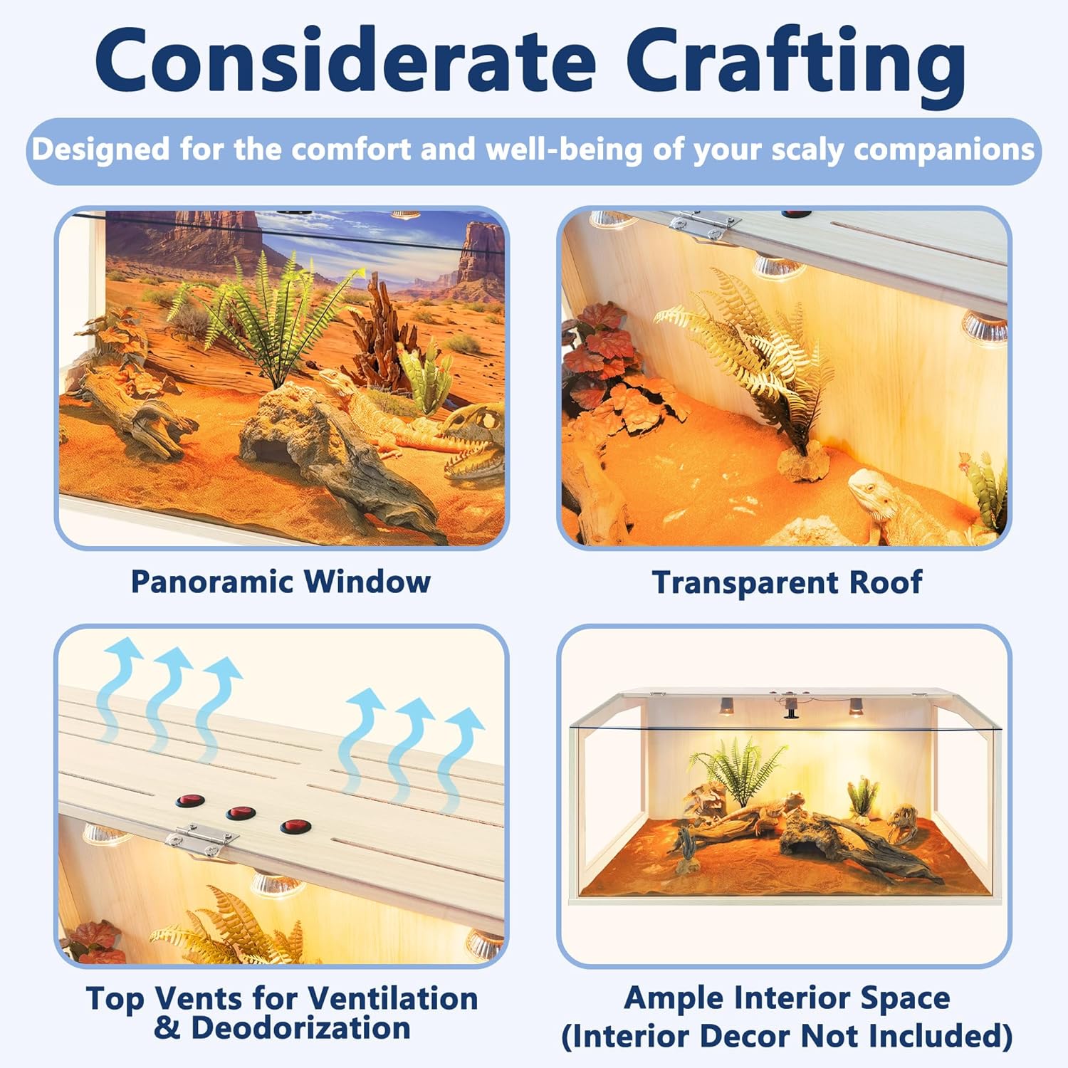 - ăSuperb Reptile HabitatăDesigned for reptile lovers, our enclosure offers spacious interiors for your reptiles to roam freely. The front acrylic panel guarantees crystal-clear visibility, while top and side vents ensure optimal airflow. Please note: This habitat is not suitable for water storage. Available in 4 sizes to suit your needs!