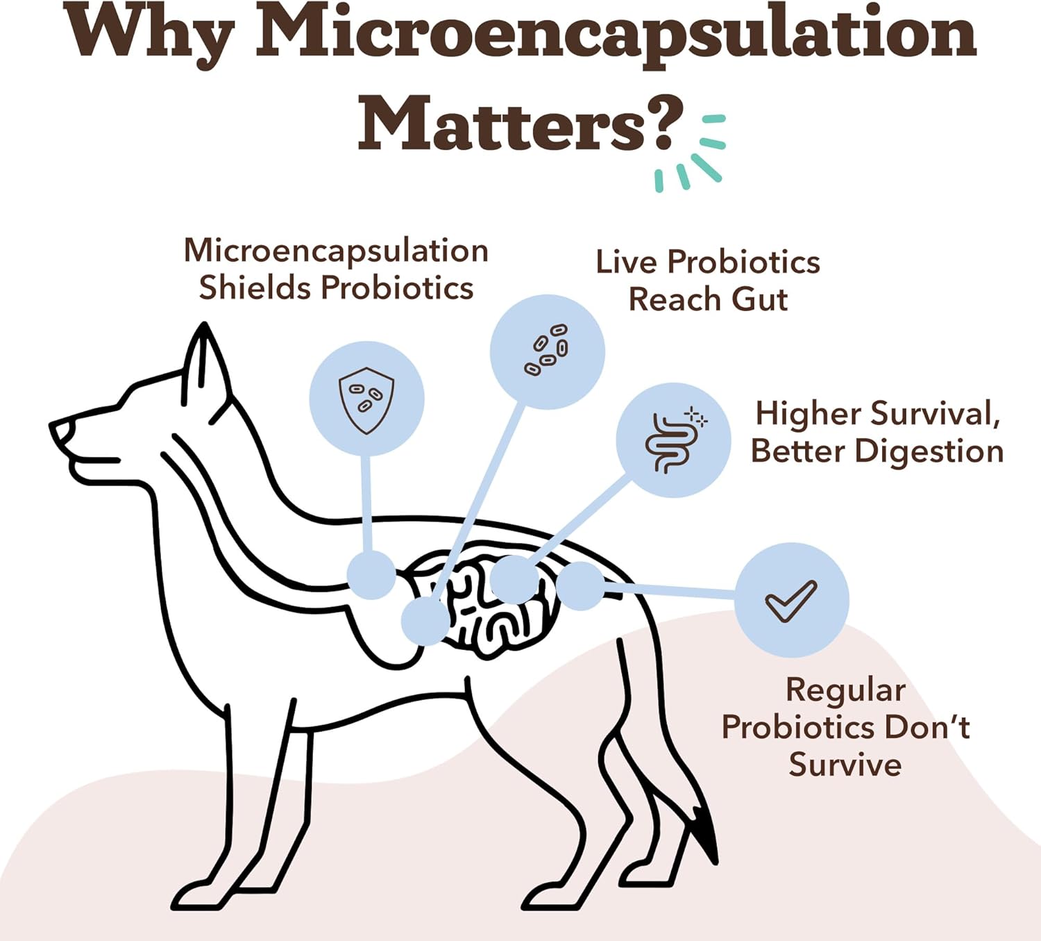 - MICROENCAPSULATED PROBIOTICS FOR MAXIMUM ABSORPTION: Unlike standard probiotics for dogs chews, our microencapsulation technology ensures live cultures survive stomach acid, delivering optimal digestion, immune boosting benefits & nutrient absorption. Great for dogs with sensitive stomachs, food sensitivities & gut imbalances.