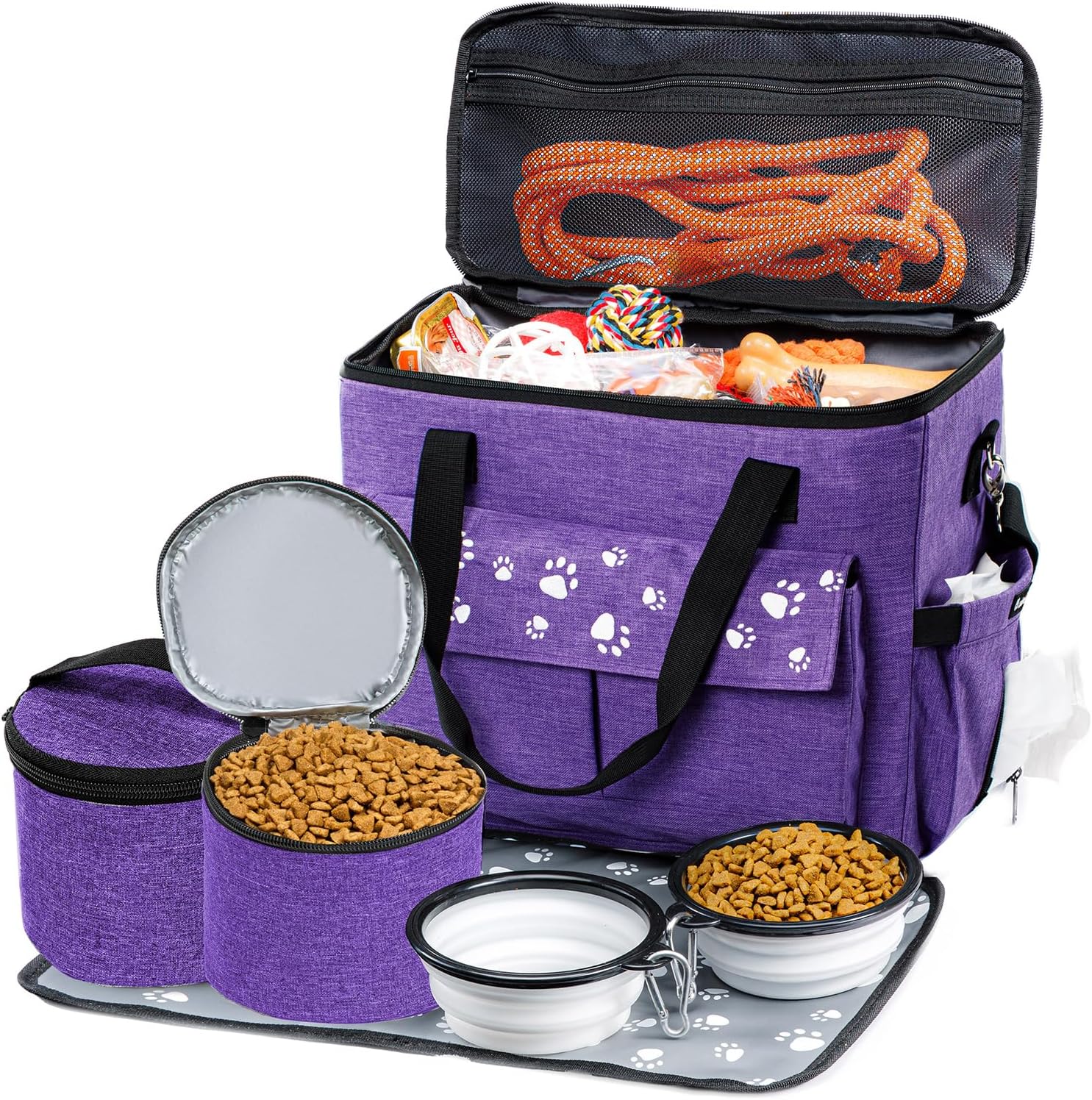 - 🐕Pet Travel Bag Set Come Includes - 1 XL Dog Travel Bag, 1 Water-Resistant Placemat, 2 Travel Dog Food Bags Containers (PEVA lining easy to wipe clean), 2 Silicone Collapsible Travel Dog Bowls, 1 Removable Shoulder Strap! Makes the perfect dog weekend travel bag.