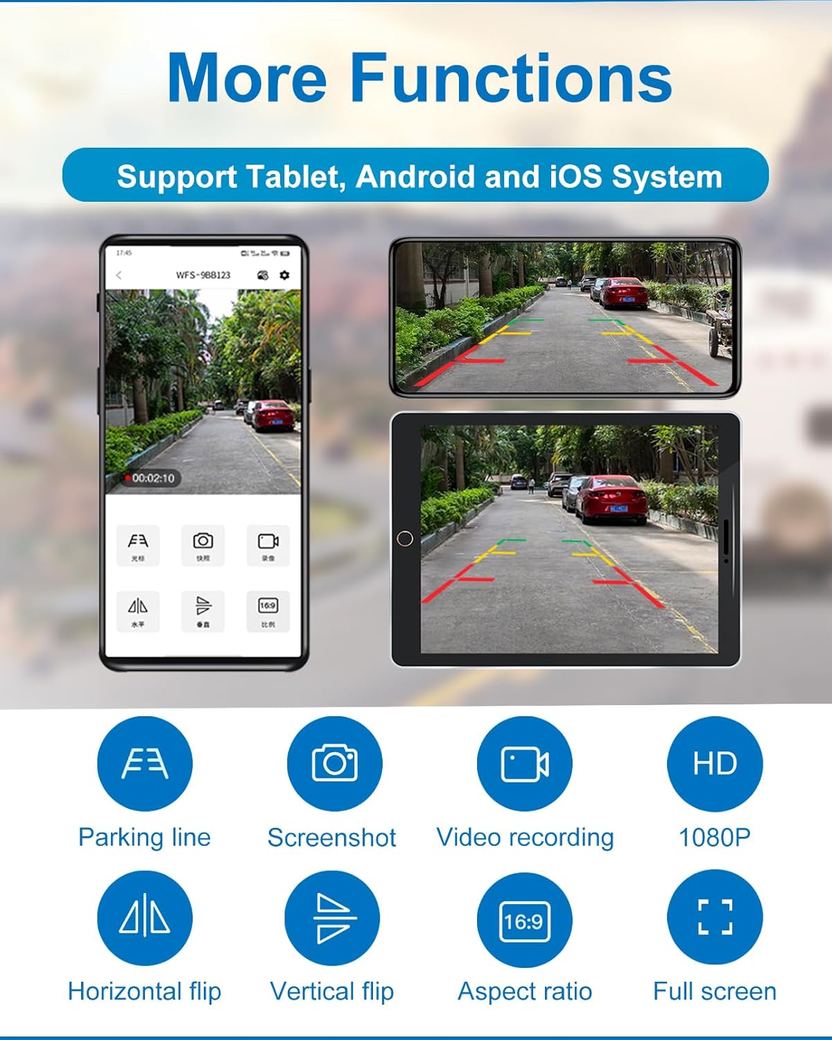 - ăFull HD Image Quality, IR Night VisionăWith 1080P HD color CMOS sensor, 1920*1080 pixel (720P output) and IR-Cut module, the camera provides you with high-definition and realistic images. Equipped with 4 infrared LEDs, the camera has 17ft/5m night vision distance and offers excellent night vision in pitch-dark environment to make reversing safer