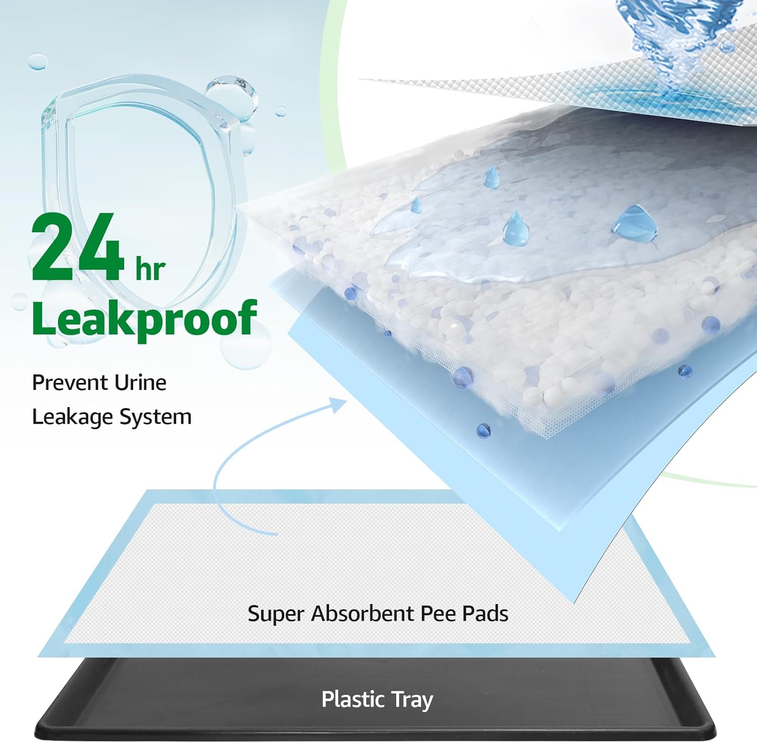 - 5 DISPOSABLE PEE PADS: The dog potty system come with an incredible dog pee pad solution. Advanced absorption technology from Japan,when the drainage holes get the liquids to travel downwards, Oiyeefo puppy pee pad catch the urine and absorb it quickly, so the extreme odor-causing issues can be easily curbed.