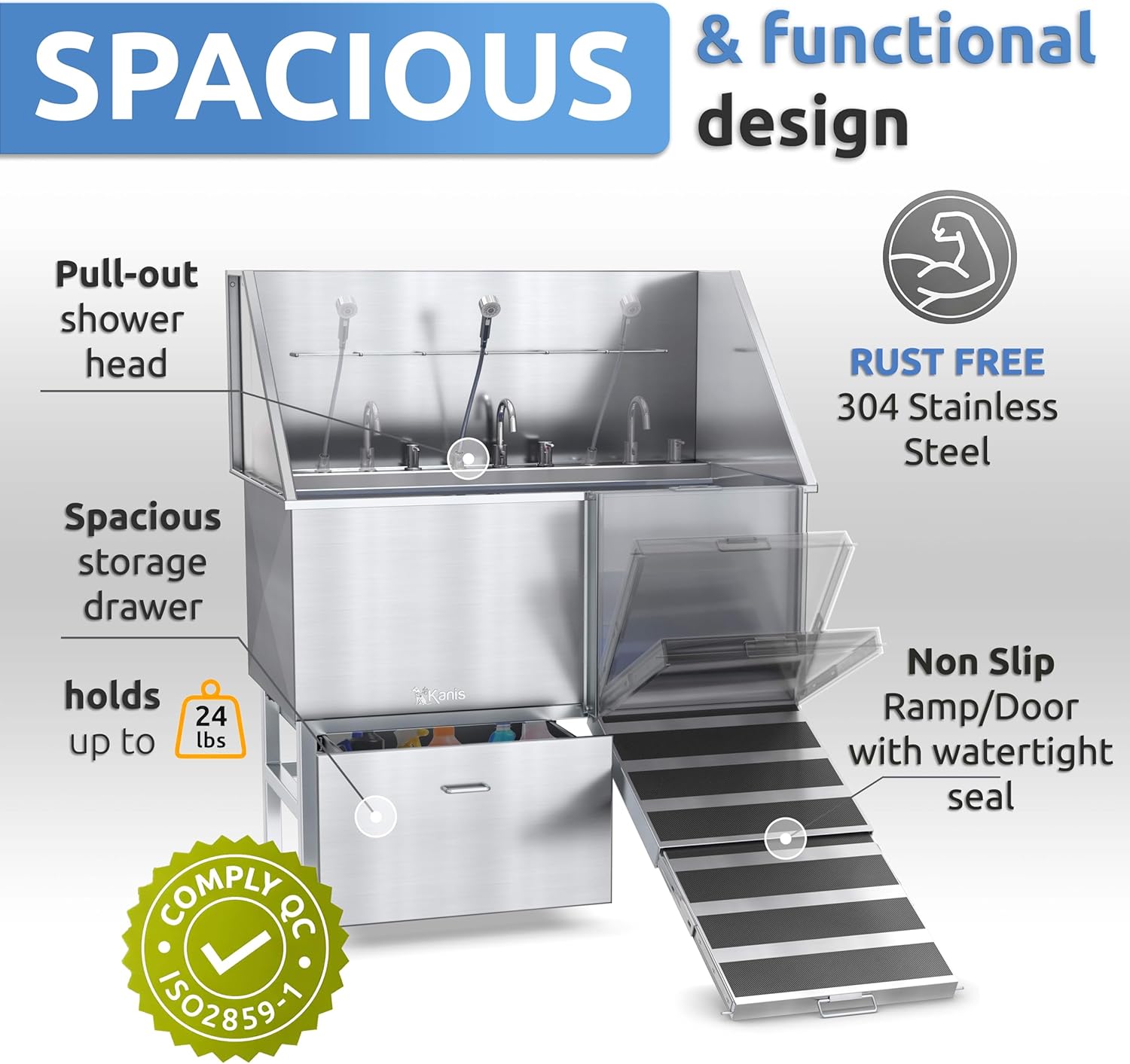 KANIS Professional Dog Washing Station - 304 Stainless Steel Pet Wash Sink & Grooming Bath Tub for Home with Ramp, Shower, Floor Grate, Storage Drawer, Faucet, Drain Kit for Large, Medium & Small Pets