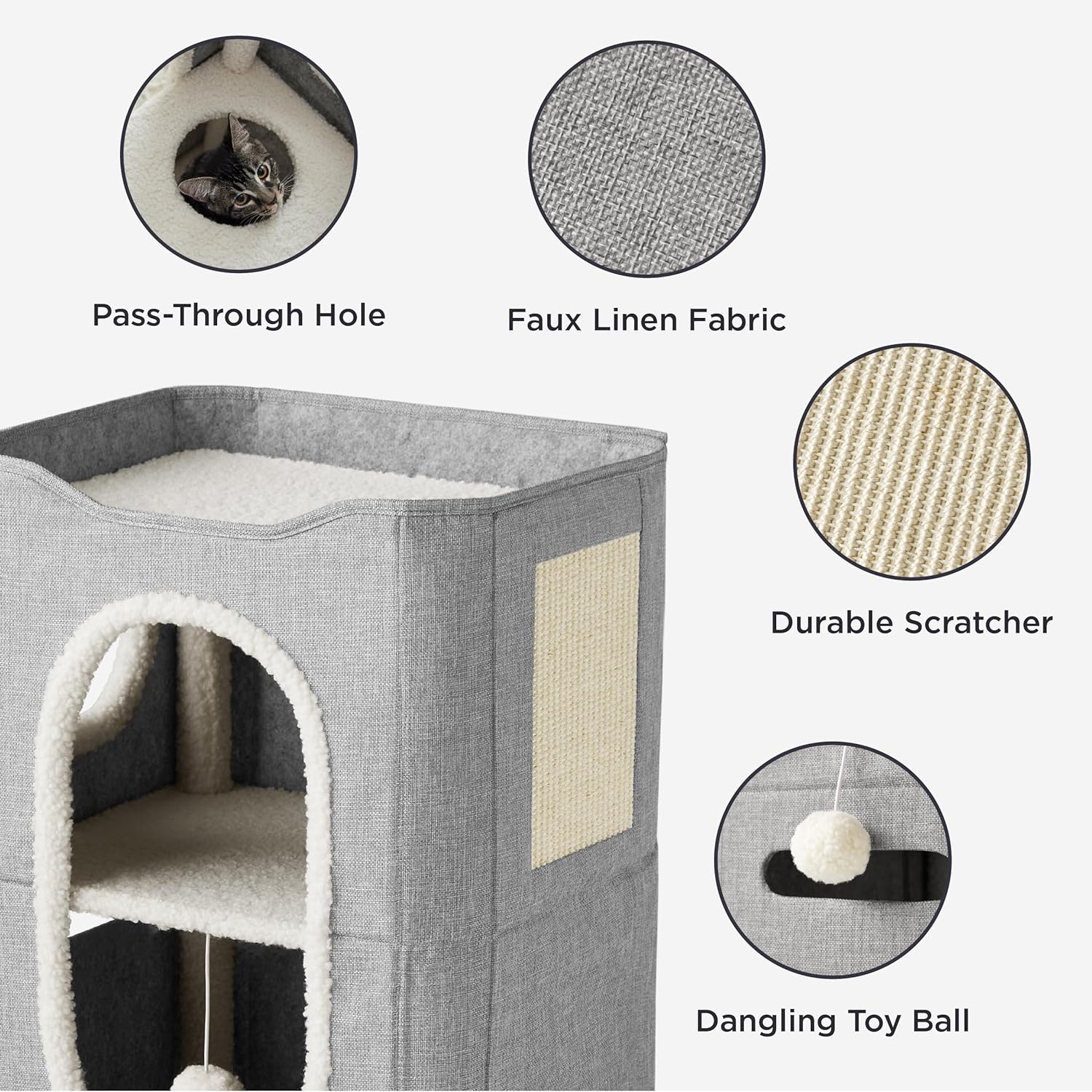 Bedsure 2 Story Cat House - Cat Condos for Indoor Cats with Scratch Pad and Fluffy Ball Hanging, Small Pet Cave Furniture Hideaway for Multi Pets, 18x14x23 inches, Grey