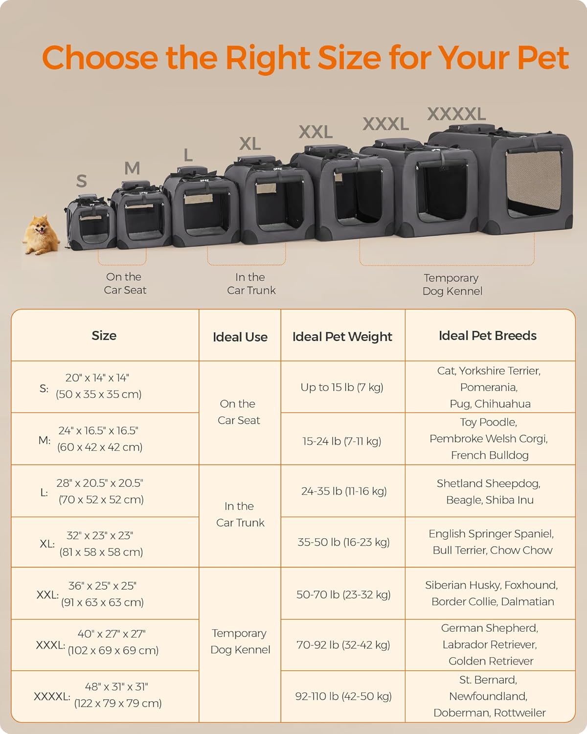 - 【CHOOSE THE RIGHT SIZE】This 24" x 16.5" x 16.5" collapsible dog carrier is ideal for pets between 15-24 lb. Please read our tips on the pictures to measure your pet and choose the right size