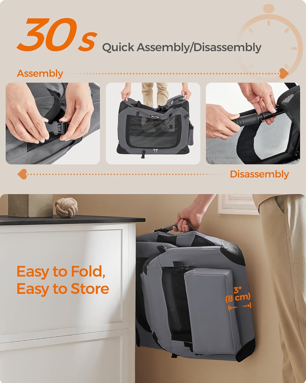 - 【QUICK ASSEMBLY & EASY FOLDING】The dog crate can be assembled in 30 seconds without tools and can be stored in the car or in the corner of your home after folding. It can be easily carried for indoor use or traveling, giving your dog a warm home anytime