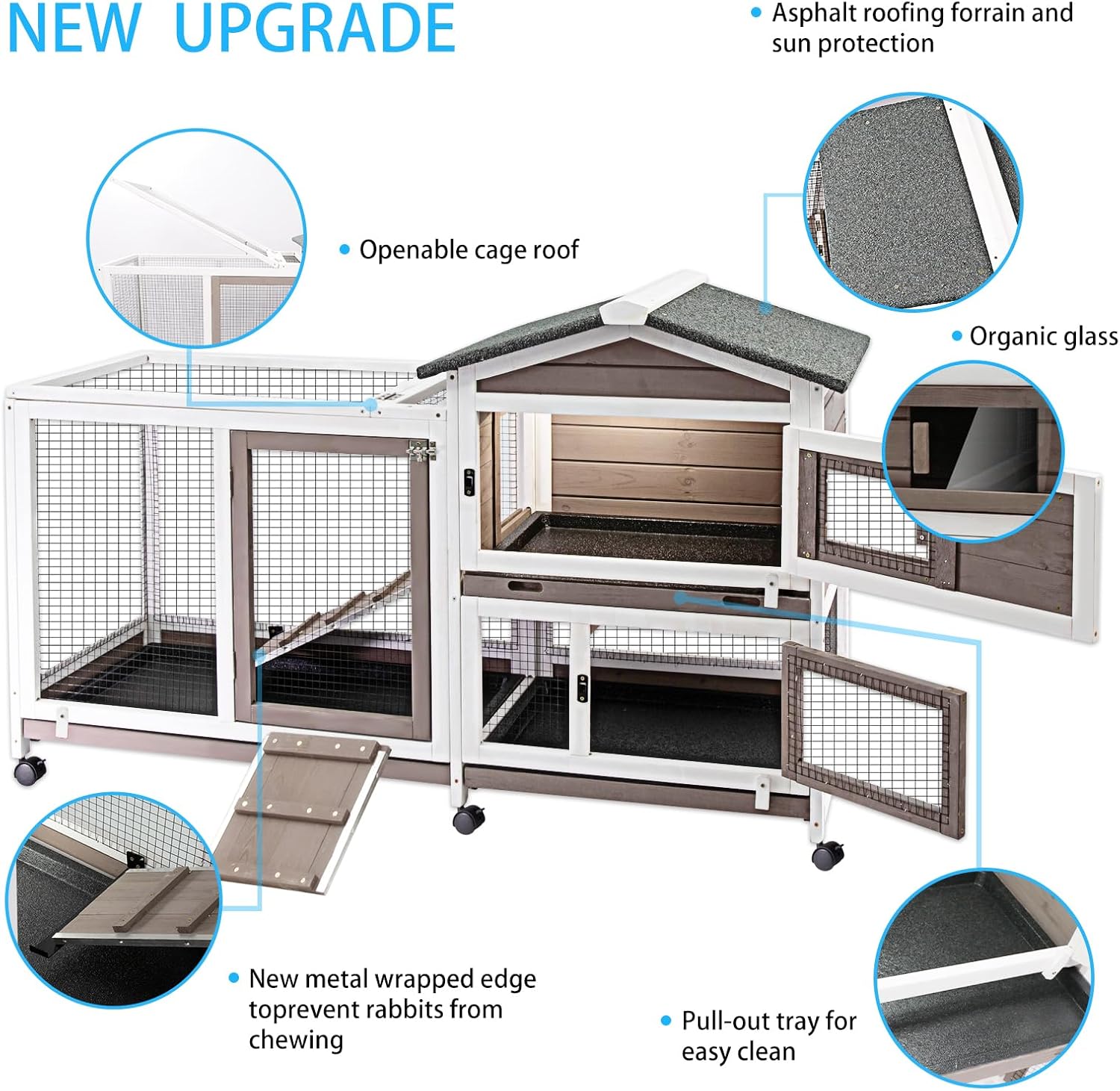 Rabbit Hutch Indoor Outdoor Two Story Bunny Hutch with Wheels Guinea Pig Cage with Removable No Leaking Tray Wooden Pet House