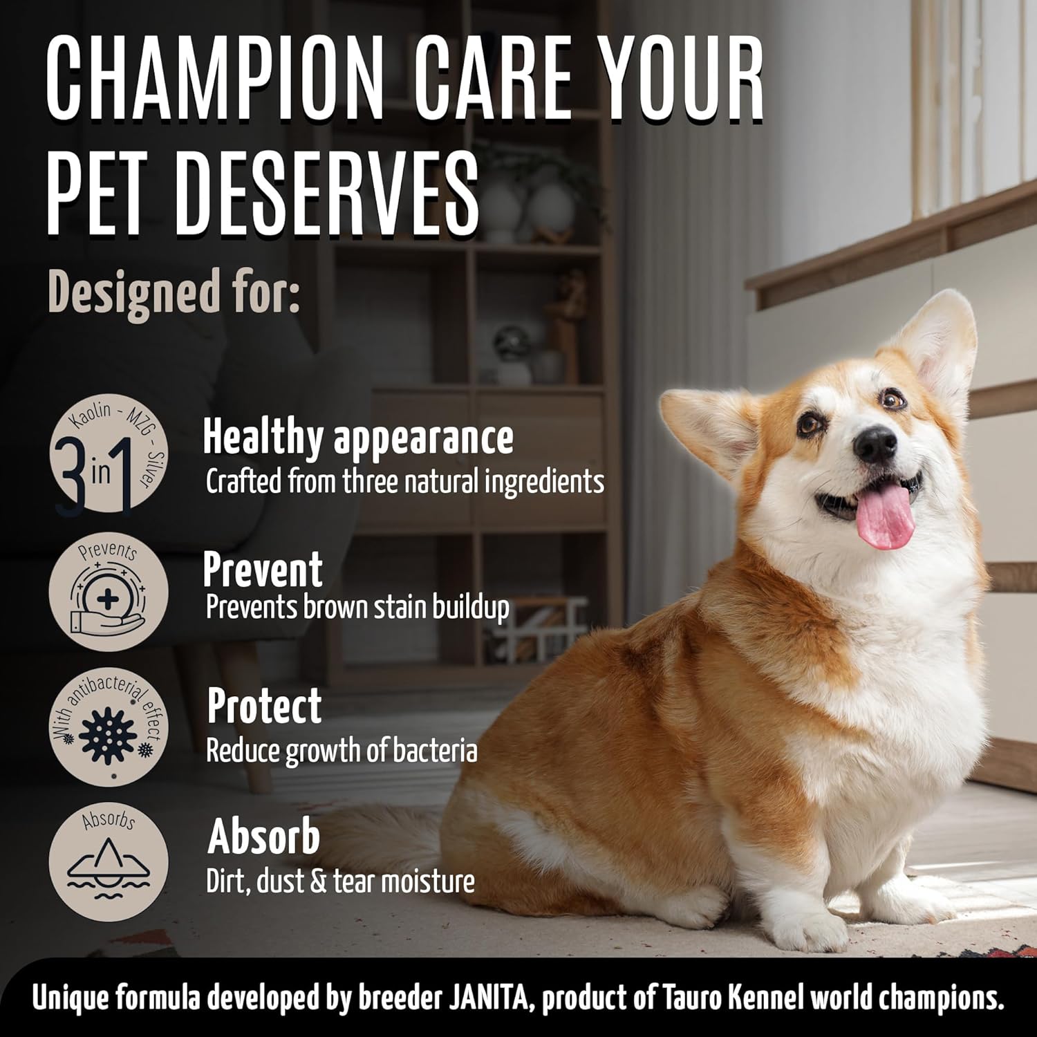 - Multifunctional duo.This remarkable solution offers a gentle yet effective way to remove dirt, dust, and brown stains that may accumulate around the pet's eyes, ears, paws, or coat, while simultaneously delivering a moisturizing effect. Both products are natural and pure and suitable for sensitive pets.