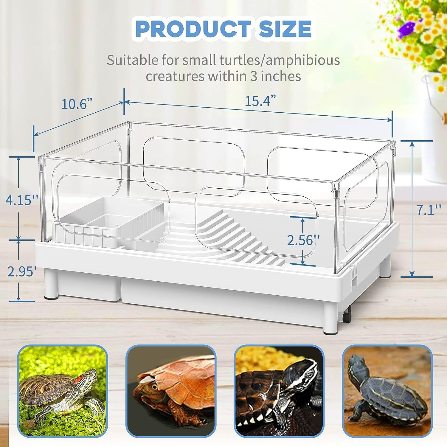 - ăCompact Tank & Easy to InstallăTank size 15.4â x 10.6â x 7.1â. Maximum water level: 2.56ââ. Perfect for small turtles, crabs and other small reptiles within 3.0ââ. The installation is an easy job with our manual inside the pack!