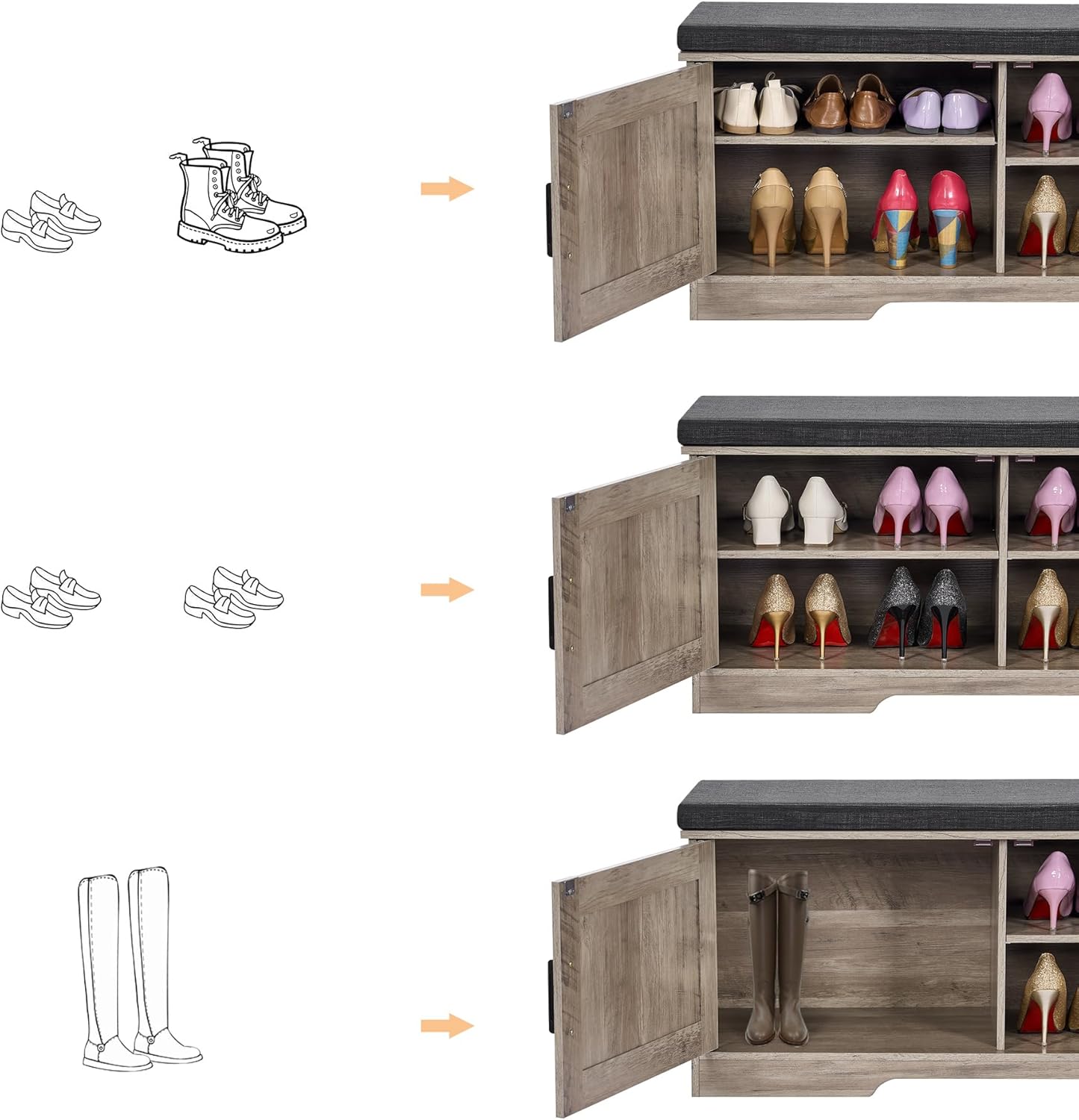 - Keep Your Shoes Organized: The depth of bench is 13.8 inches, which makes it easily to put in your shoes, meanwhile shoes of various heights can be placed by adjusting middle movable boards. The bench doors design ensures not only your privacy, but also a tidy space