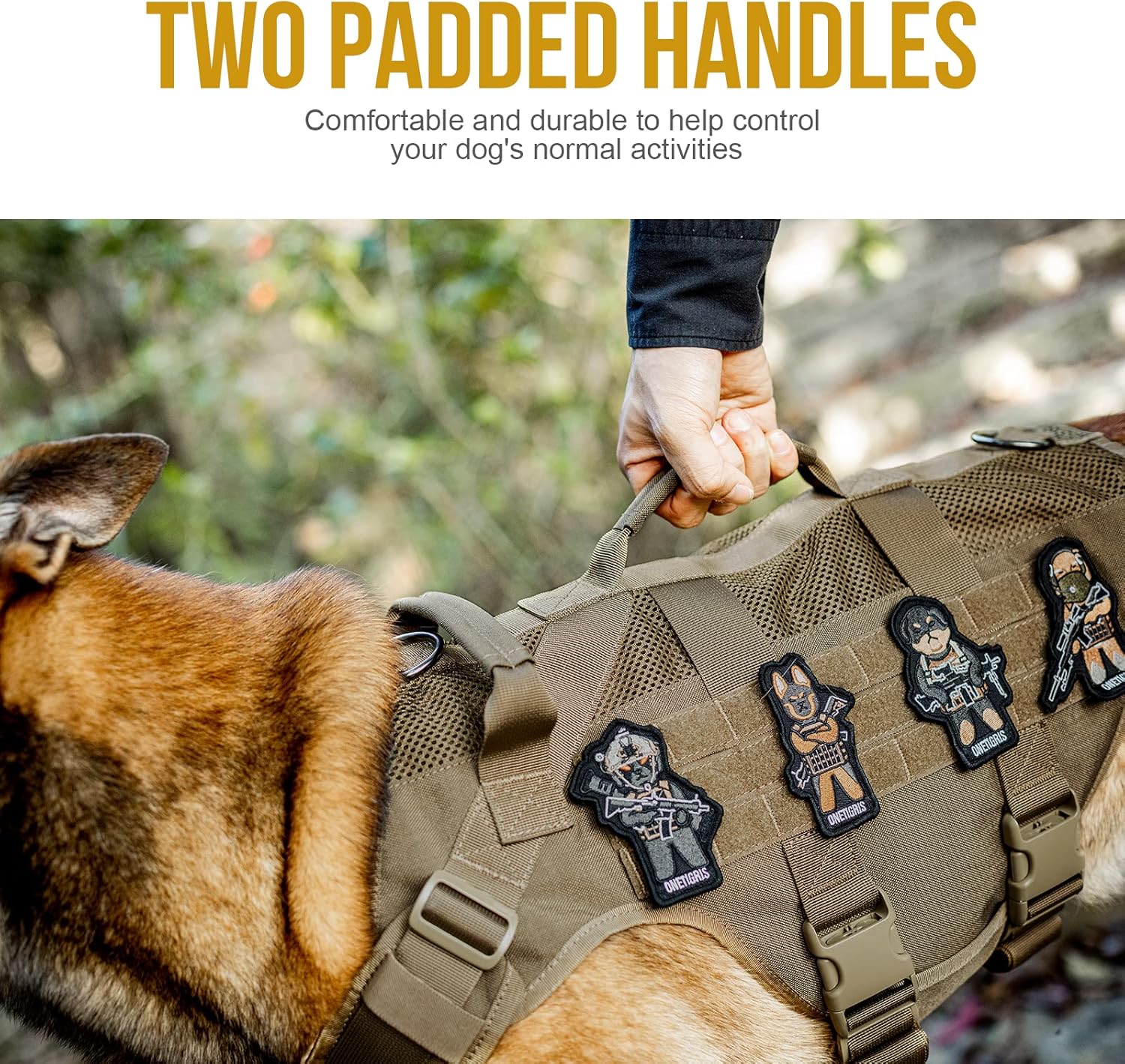 - [Molle/Handles]: Looped MOLLE panel on both sides for MOLLE compatible add-ons such as treat totes, poop bag pouches, service dog kits, military patches and name tags. 2 padded grab handles with reinforced stitchin. Useful for getting in/out of a car, immediate canine control in crowded areas or with other dogs, etc.