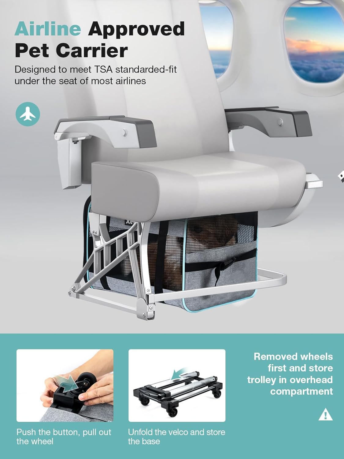 - Pet Carrier Airline Approved: Designed to meet TSA standards, this dog carrier fits under the seat of most airlines when the wheels are removed. Pet carrier size: 16.93''L x 11.81''W x 11.81"H (without wheels). Recommend for pets up to 15lbs.
