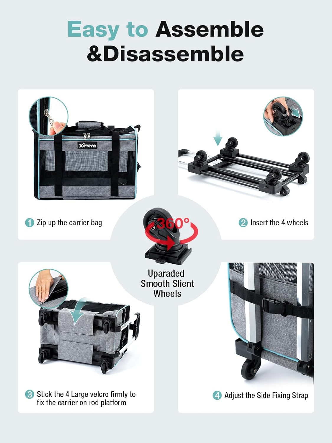 - Designed for Travel: This dog carrier with wheels has a telescopic handle, removable base with wheels. The 360° rotating wheel provides a stable and quiet ride on any surface. The rolling cat carrier also features a carrying handle and adjustable shoulder strap for easy transport.