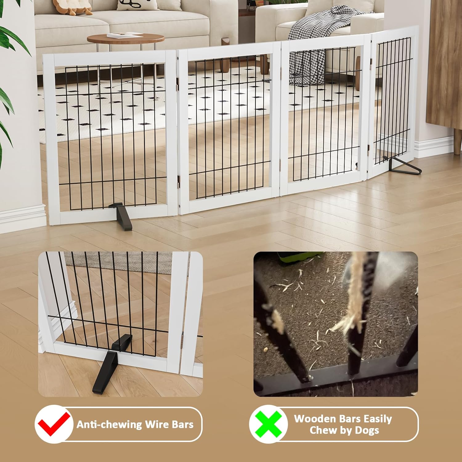 - [Resist Chewing] Unlike wooden dog gate, our wire pet gate come with durable metal bars to resist chewing from our furry friends. This free standing pet gate can be fold in different shapes and barricade your pets in doorways, entryways, halls, bedrooms, stairs, kitchen