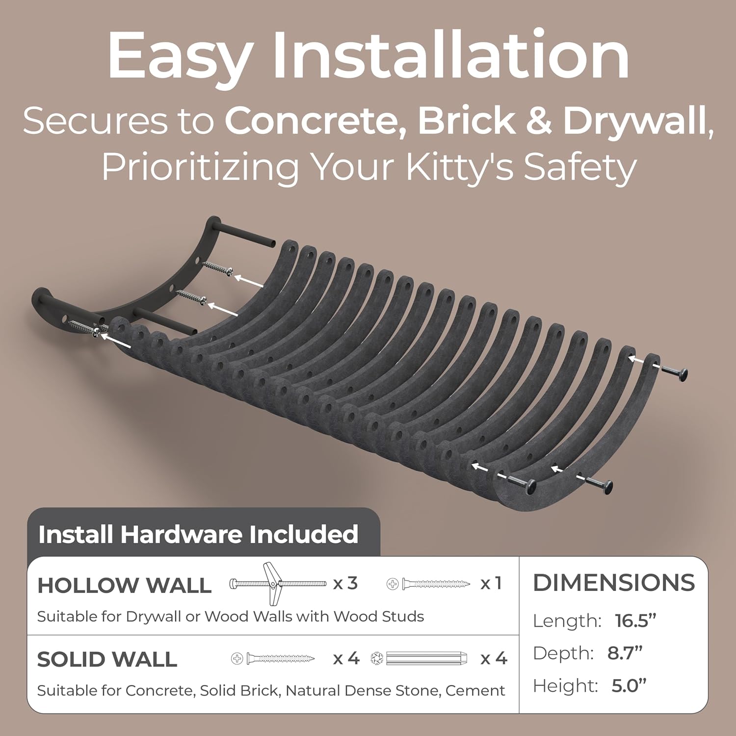 - Effortless Paradise: This cat hammock and wall bed includes all installation hardware, allowing your fur-baby to start exploring right away. Our cat climbing shelf securely attaches to concrete, cement, brick, dry wall and more ensuring your cat’s safety.