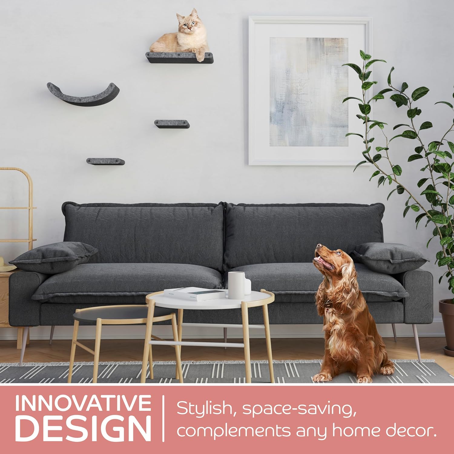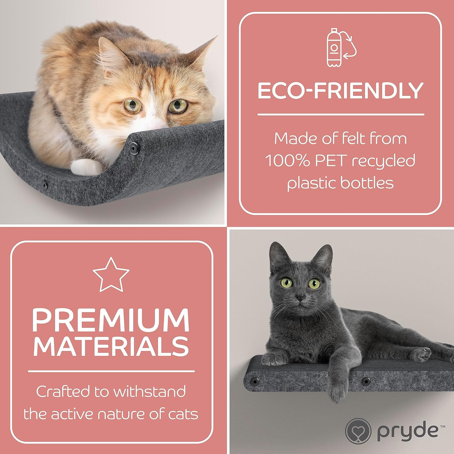 - INNOVATIVE AND SUSTAINABLE | Soft to the touch, firm in structure, and very tactile β cats love it! Our patent-pending cat shelf material is acoustic felt which is made from 100% Recycled PET bottles! It's built to withstand extended wear and tear.