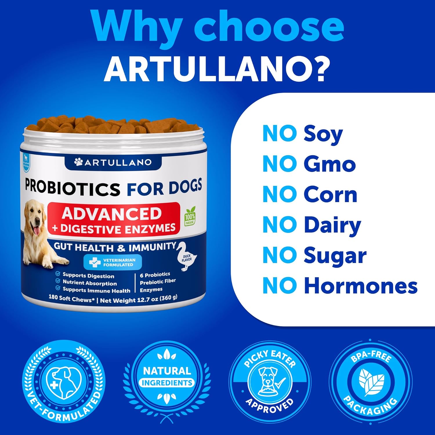 - Delicious Duck Flavored Soft Chews: Dogs will love the tasty chicken flavor of this probiotic for dogs treats, eliminating the need for messy powders, measuring, or hard-to-swallow pills.