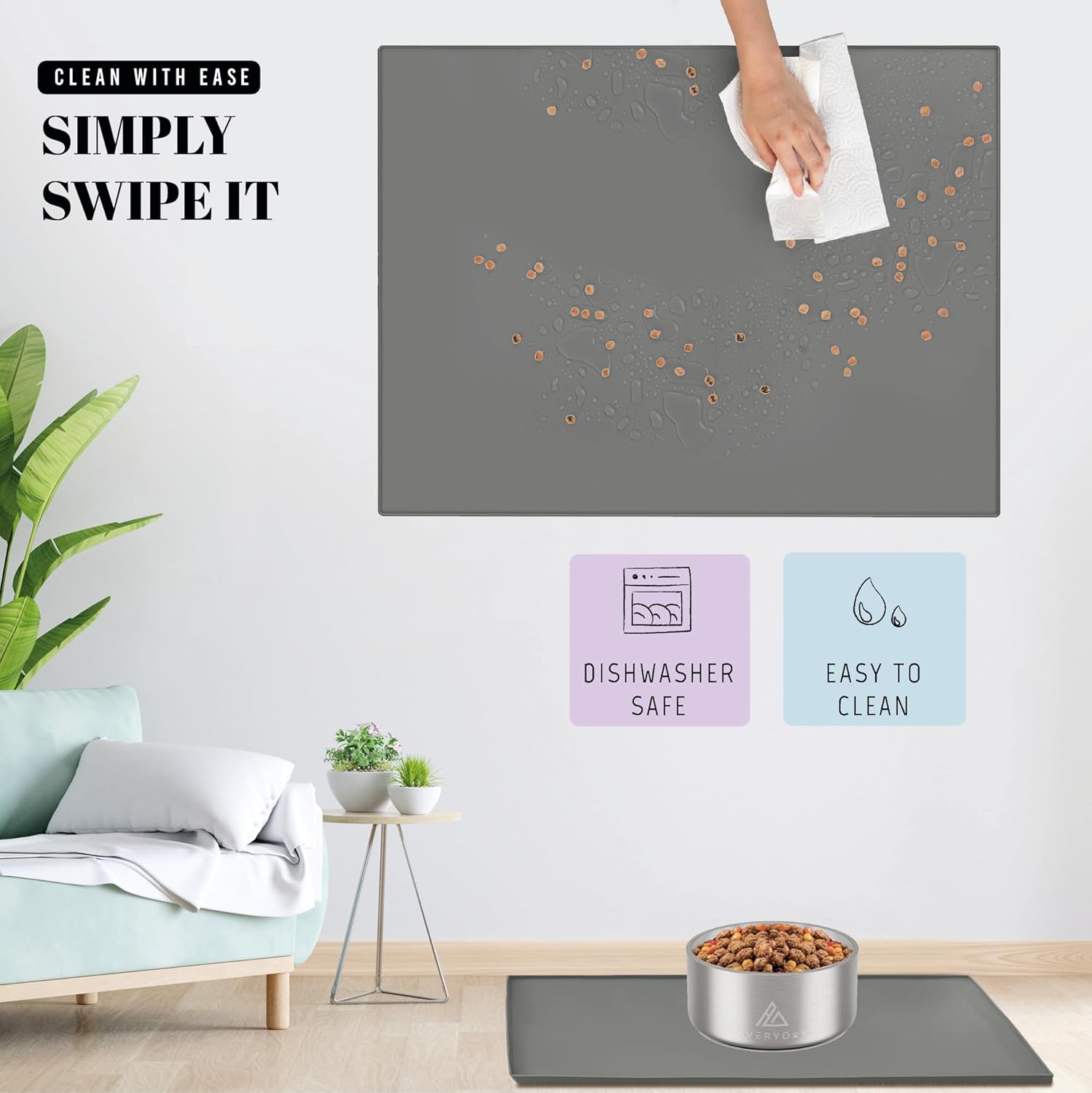 - Non-Slip Design: No more sliding bowls! AVERYDAY's heavy-duty pet mat stop bowls from sliding during meals. The dotted surface boosts slip resistance, ensuring your pets' food and water bowls stay securely in place