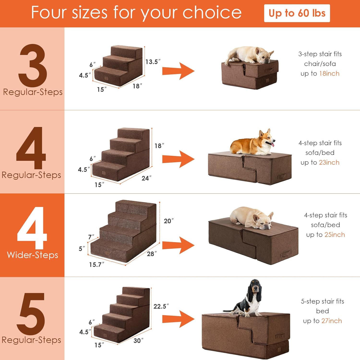 - MULTIPLE STEP SIZES - This dog stair comes in 3, 4, and 5-step options. Our 3-step pet stair is ideal for sofas and low beds (up to 18 inches high), while the 5-step version is better suited for higher beds (up to 27 inches). If your bed is of medium height (up to 23 inches), please select the 4-step one.