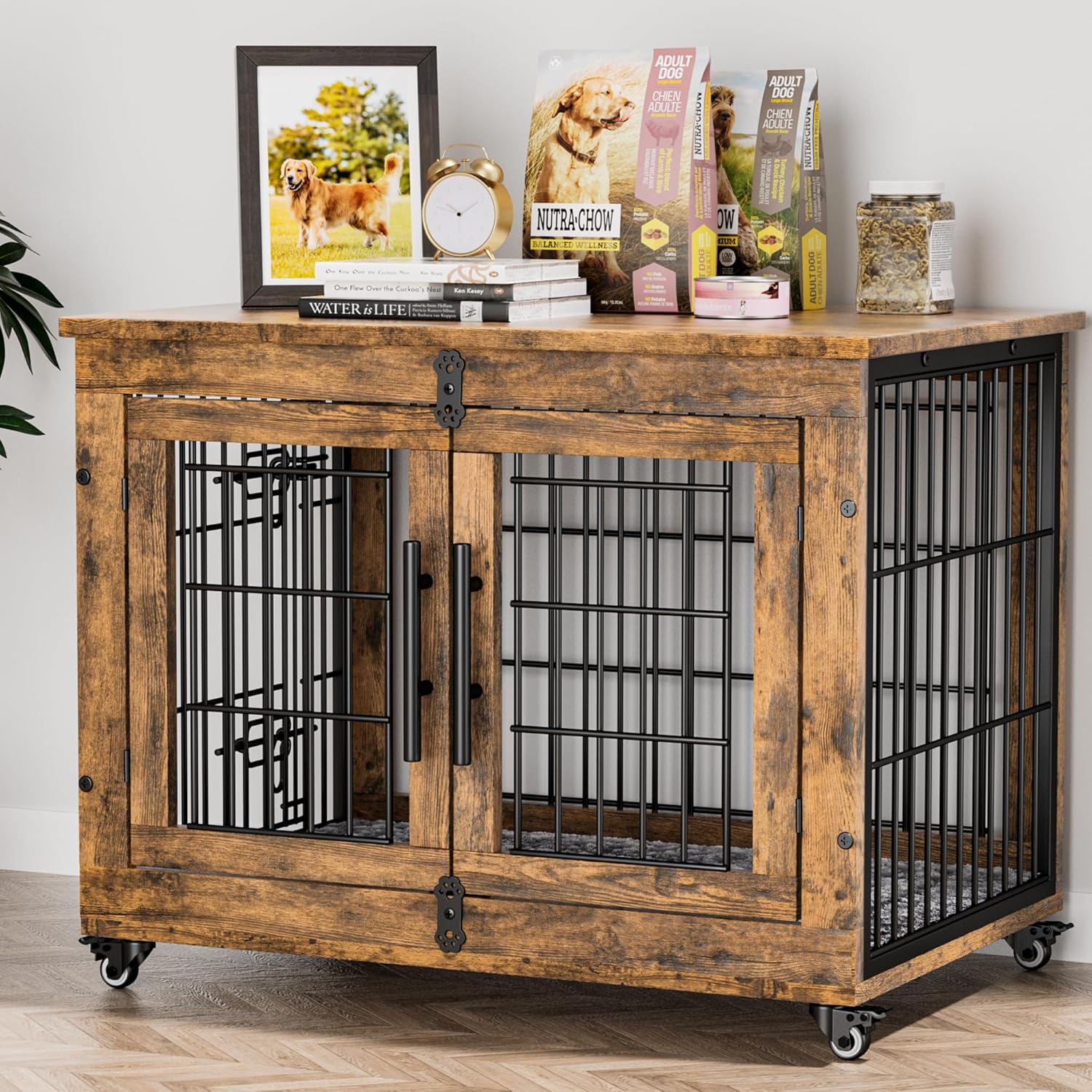 Lulive Dog Crate Furniture, Dog Kennel Indoor Double Doors Wooden Dog Cage, 32'' Heavy Duty Dog Crate with Cushion & Wheels, Decorative End Table Pet House Chew-Resistant for Medium/Small, Brown