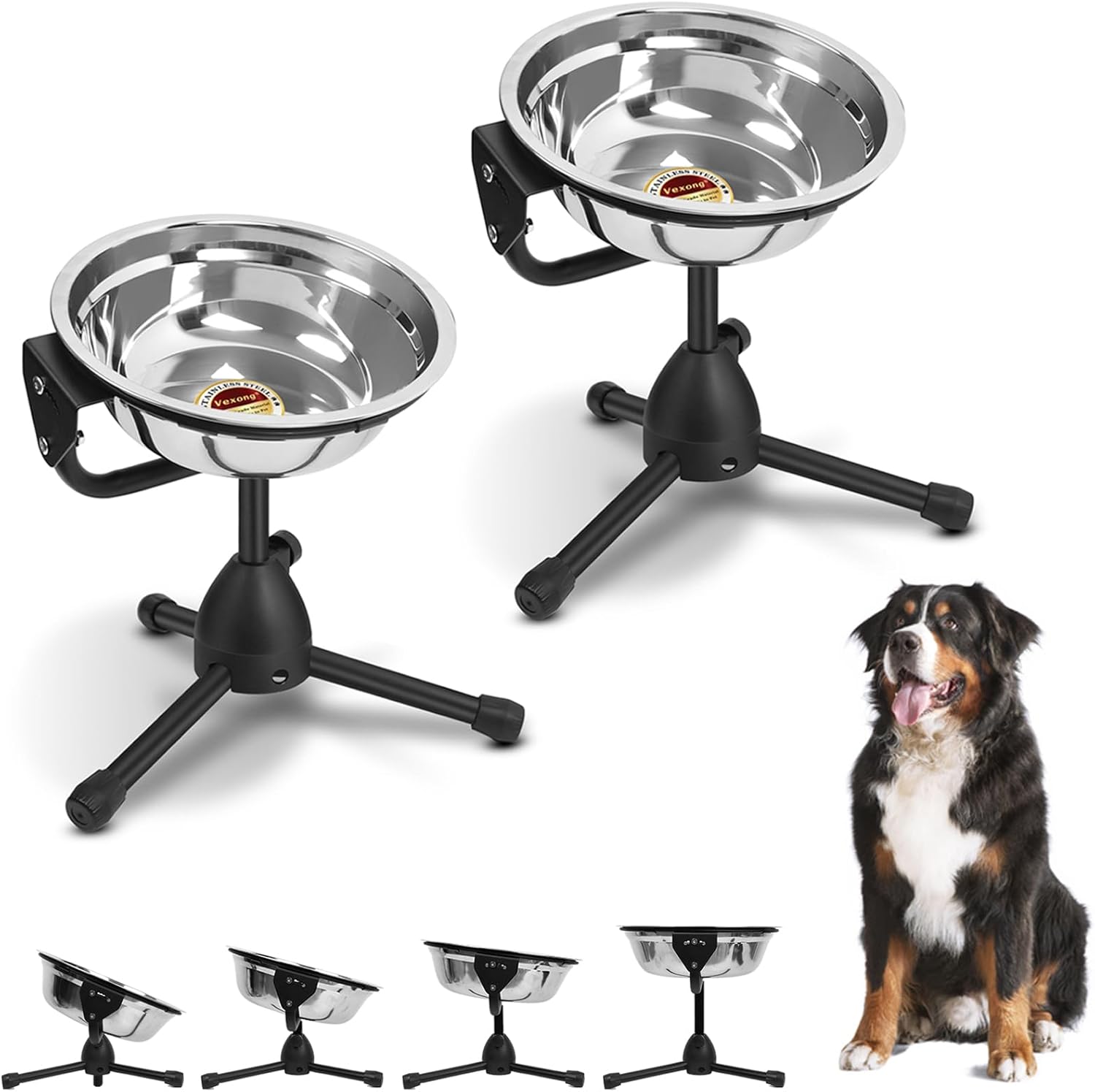 - 【Metal Stand & No-slip Design】This dog bowl set includes a metal stand which is sturdy, durable, and rustproof. The long legs of the tripod stand make the unit more stable. The rubber caps at the ends of the legs prevent the elevated dog bowl stand from moving around on the floor. The plastic tubes on the bowl holder prevent the dog food and water bowl from moving while the dog is eating or drinking. The product is not dog dishes for small dogs, but stainless steel pet bowl for medium breed.