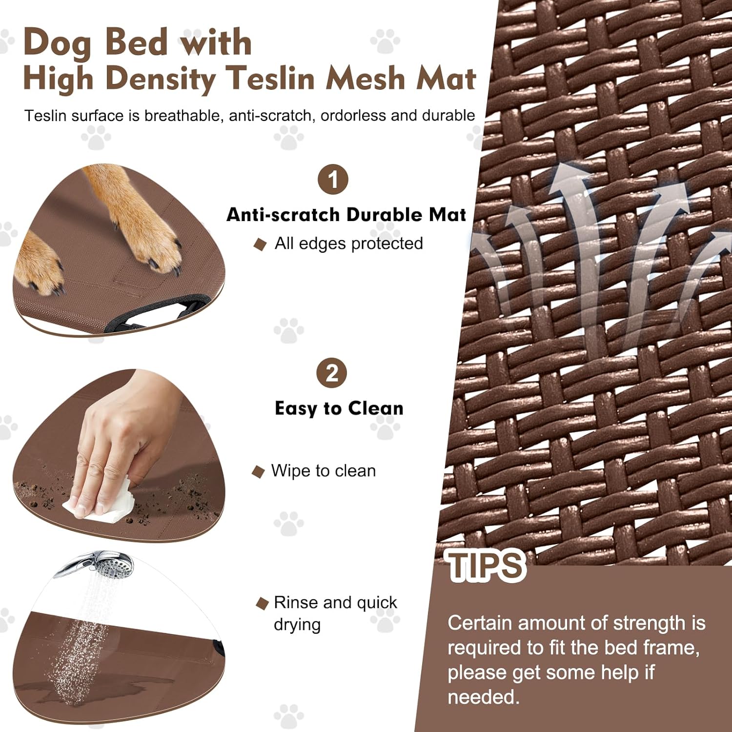 - Elevated Pet Cot With Anti-Scratch Breathable Bed Mat: Features a high density teslin breathable meshing bed mat, this bed is anti-scratch, breathable and odorless, no sticking hair and can be easily cleaned up by wiping or hosing off and keep clean. With this elevated dog bed with a large canopy, our furry kids will be better protected from ground heat and scorching sun in summer and keep dry in light rain (cover is recommended in heavy rain), let them have a cozy summer!