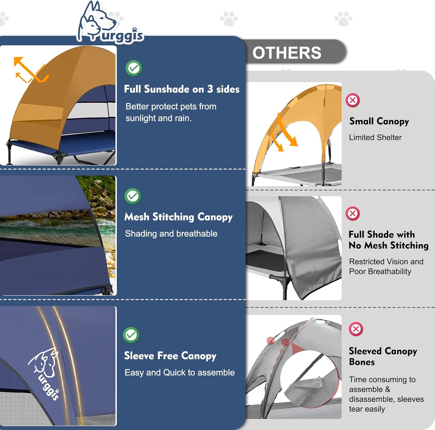 - Wider & Larger Shade Lifted Dog Bed: Comes with a large waterproof UV-proof canopy, this outside dog bed provides great shade than most other dog cots. Further more, with mesh piecing on 3 of the sides, this canopy will allow great air flow and will not block dogs' view. With this item, you will be rest assured when pets relaxing outside in summer;