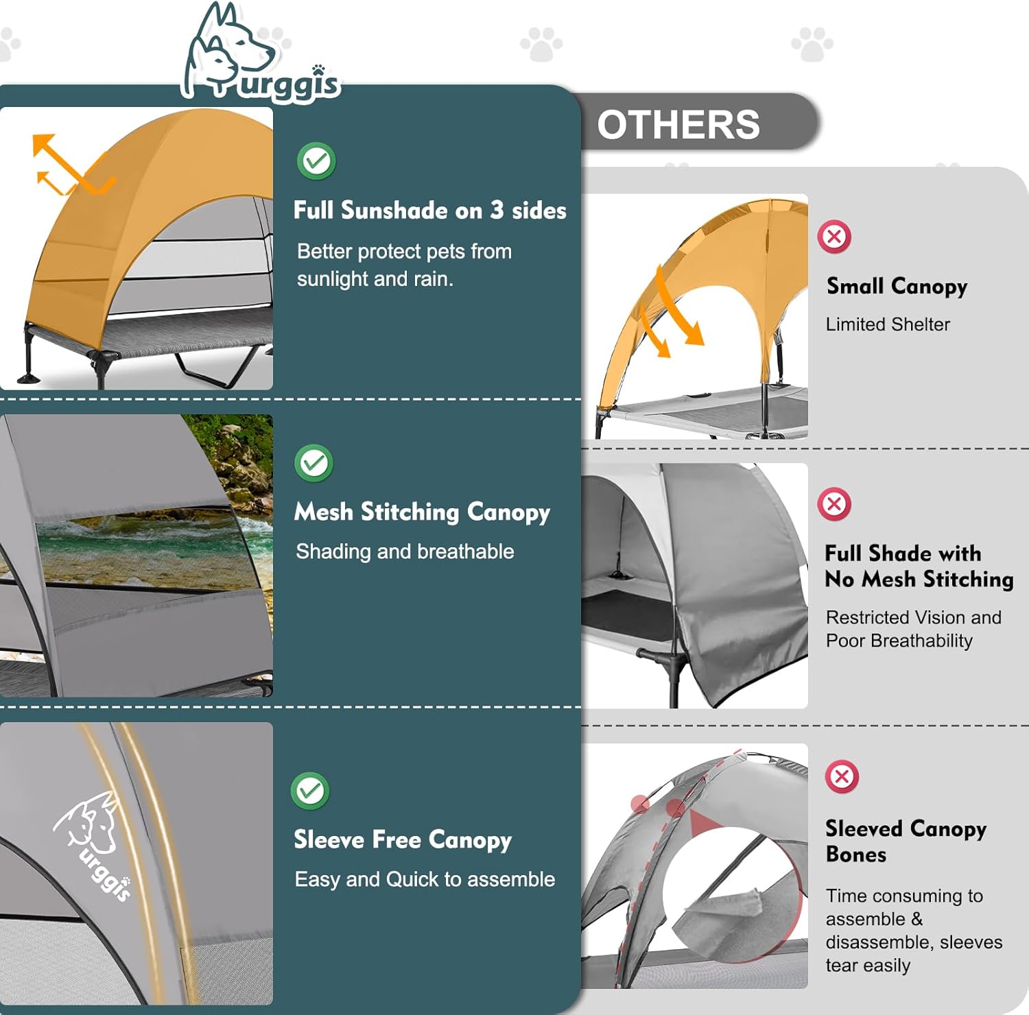 - Wider & Larger Shade Lifted Dog Bed: Comes with a large waterproof UV-proof canopy, this outside dog bed provides great shade than most other dog cots. Further more, with mesh piecing on 3 of the sides, this canopy will allow great air flow and will not block dogs' view. With this item, you will be rest assured when pets relaxing outside in summer;