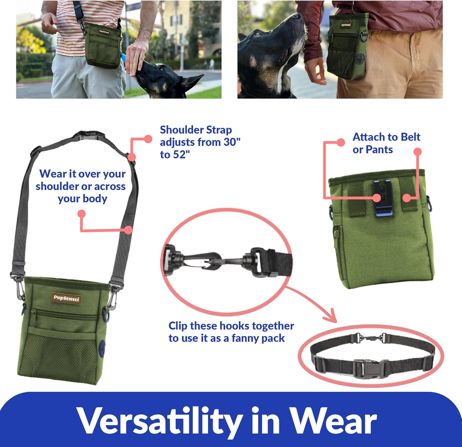 - Versatile Usage: The dog treat bags training pouch comes with an adjustable strap and metal clip, allowing you to attach it to your belt or bag. Ideal as a dog training kit, it doubles as a dog treat fanny pack.