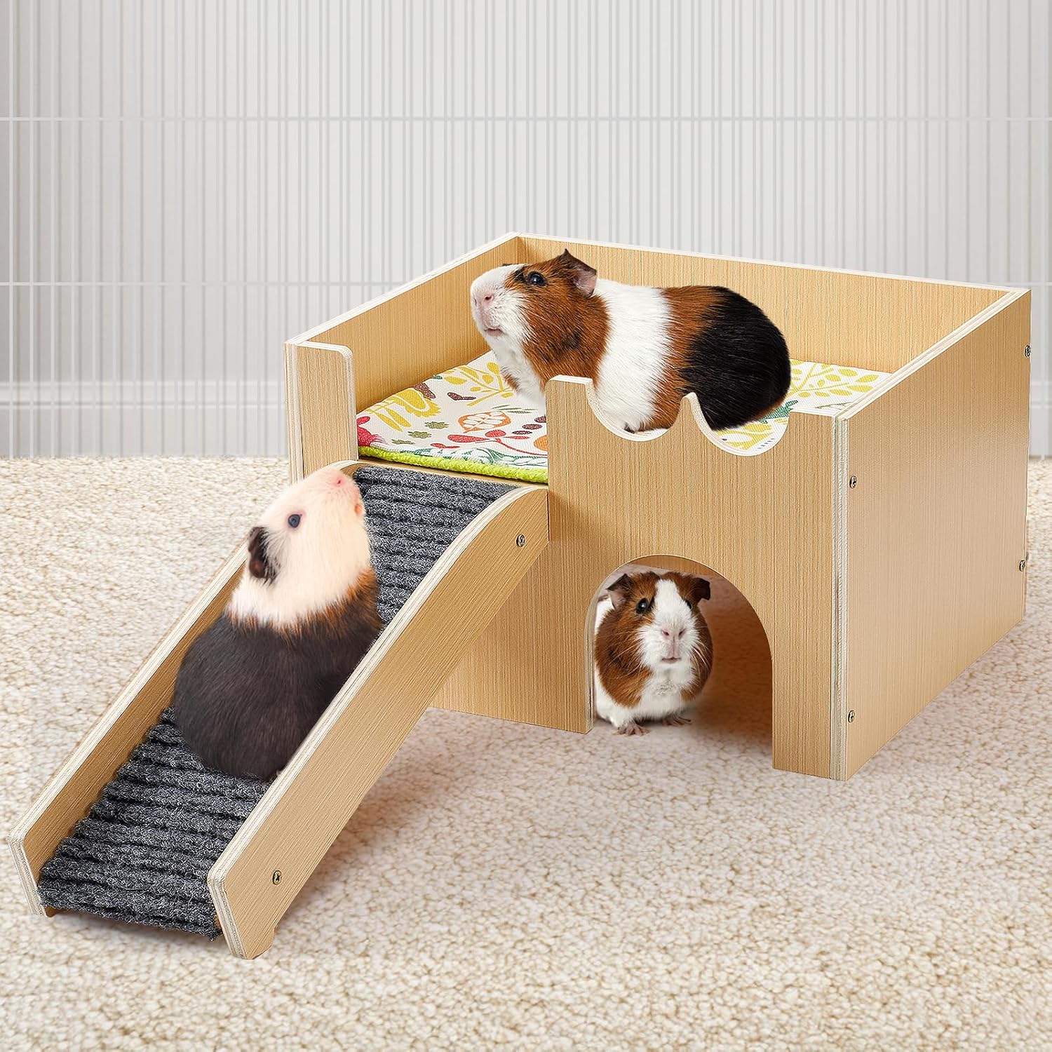 - WITH STAIRS: Our guinea pig house boasts a staircase covered with plush mats, facilitating easy movement for guinea pigs. This not only reduces boredom but also helps relieve bad moods—undoubtedly the perfect guinea pig toy for hiding, resting, and playing.