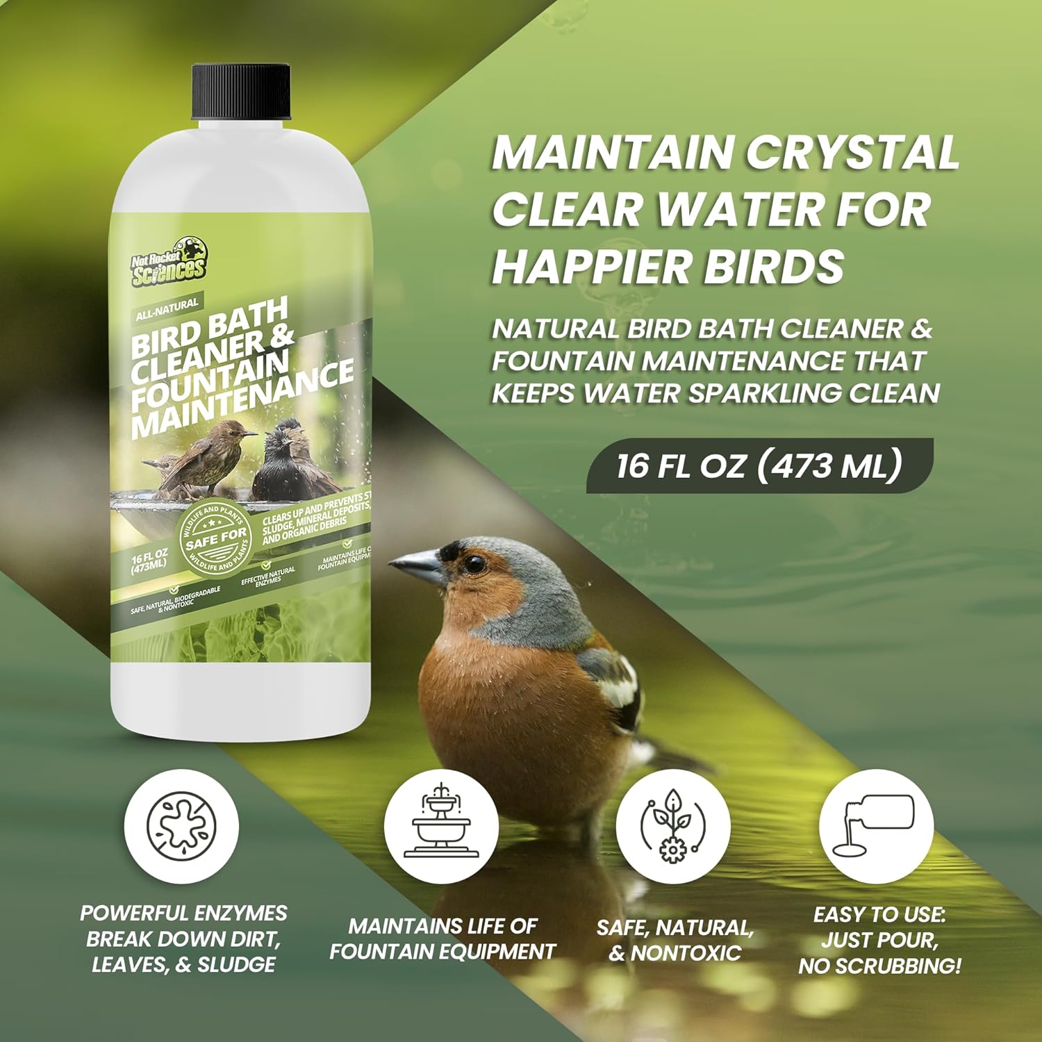 - SAFE FOR BIRDS: This bird bath & fountain clarifier is natural, non-toxic & safe for birds and wildlife. It’s ideal as a birdbath & fountain maintenance cleaner that safely prevents organic build up.