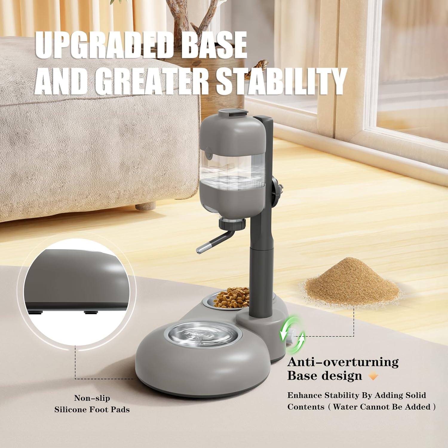 - 【Anti-overturning Base】In order to solve the pain point that the vertical water dispenser is easy to be overturned by pets,MITOCAPY conducted a series of experiments and finally designed this anti-overturning pet water dispenser.With these non-slip silicone foot pads on the bottom of the base,MITOCAPY dog water bottle dispenser has a greater stability than normal vertical water dispenser.Even you could also enhance much more stability by adding solid contents into the base,such as sand, pebbles and so on.