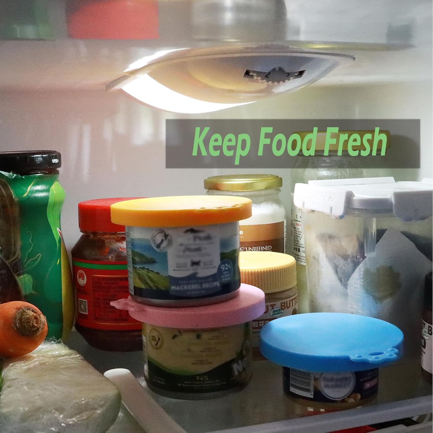 - UNIVERSAL SIZE: 4 x Cat Dog Food Can Lids Silicone covers (Pink/Green/Blue/Orange) & 1 x Pet spoon Can Opener (Grey). The lids have 3 different ring sizes with some stretch to fit most standard size pet cans. The can opener is also universal and can easily open a variety of cans.