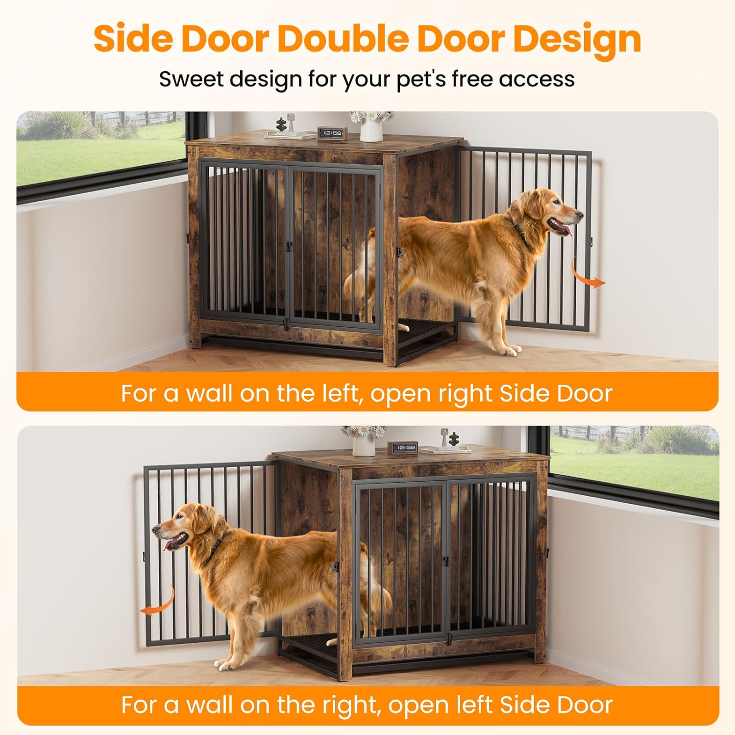 - ăDouble Side Door DesignăThis furniture-style dog kennel indoor has front and two side openings for access, both the left side door and the right side door can be opened to fit various spaces, definitely an ideal crate for your home