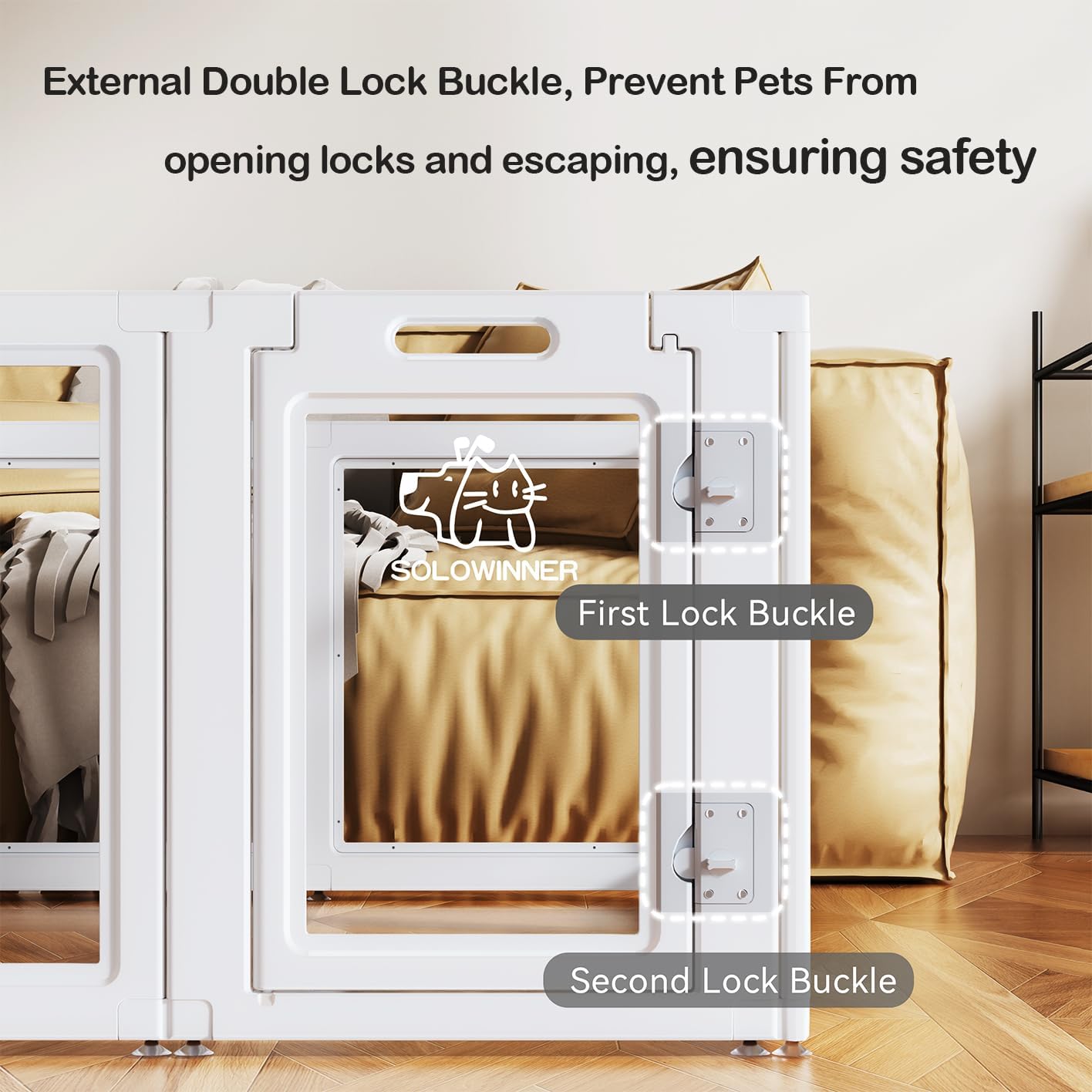 - 【NEWEST TRANSPARENT DOG PLAYPEN】SOLOWINNER clear puppy playpen broke the traditional cage fence design and adopted high-quality PE material and PET board, it's like a bright yard, more beautiful and atmospheric, easy clean, which makes your furry friend no longer anxious and feel like live in prison, never worry about your pet stucking in the fence, besides, it's convenient for you to observe your beloved pets.