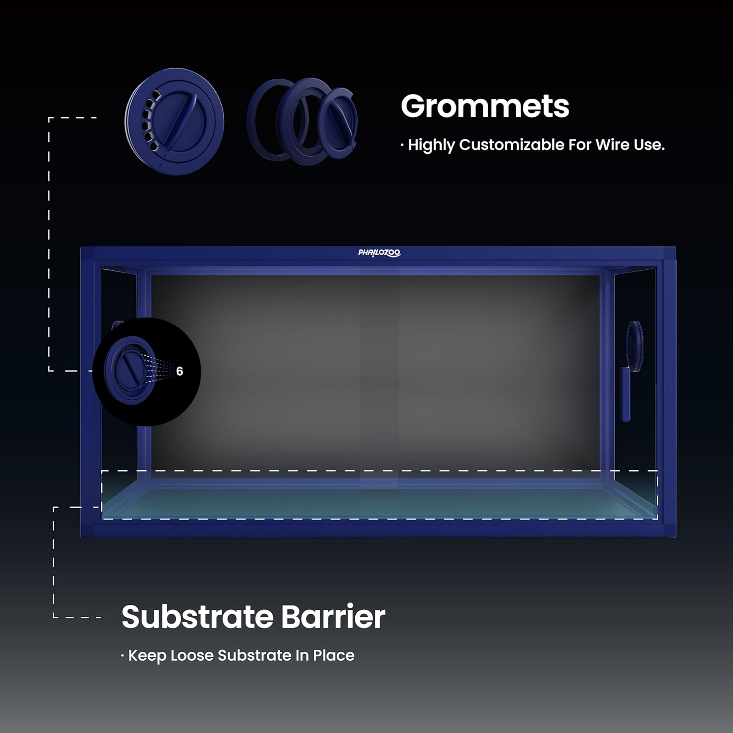 - ăEasy MaintenanceăFront opening reptile terrarium with door handles included for easy cleaning & feeding. No more suction cup problems or unsightly fingerprints all over. The substrate barrier keeps the substrate in place. Our tempered glass doors are durable enough to withstand scratching.