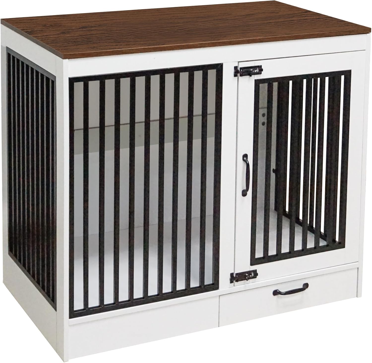 White Heavy Duty Furniture Dog Crate, Wood and Metal Kennel Cage, Pet House End Table with Drawer and Pull-Out Design, Dog Home for Indoor use, Large Size