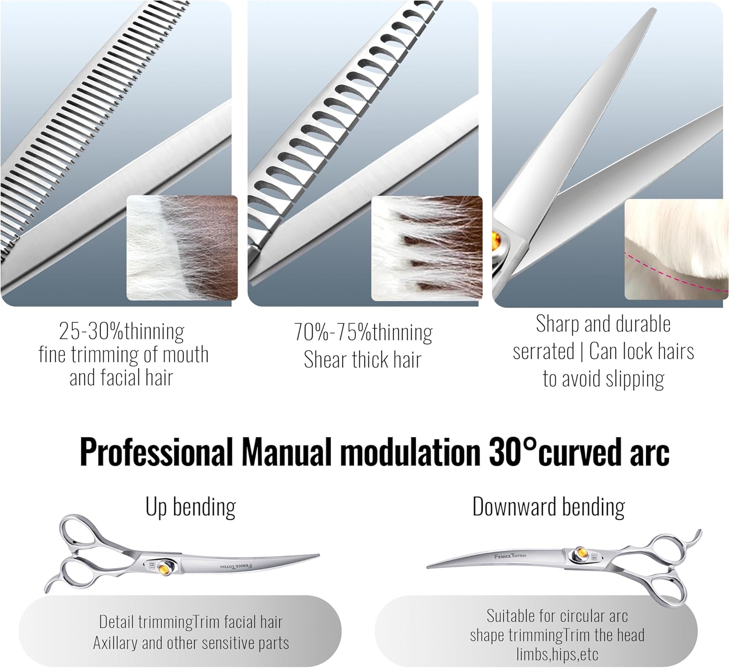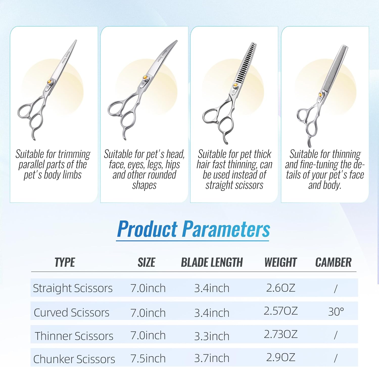 - Features: These pet scissors set with ergonomic handles that fit most people. Fine polished brushed surface with delicate metal texture. Precise adjustable screws effectively prevent the screws from loosening due to prolonged use.