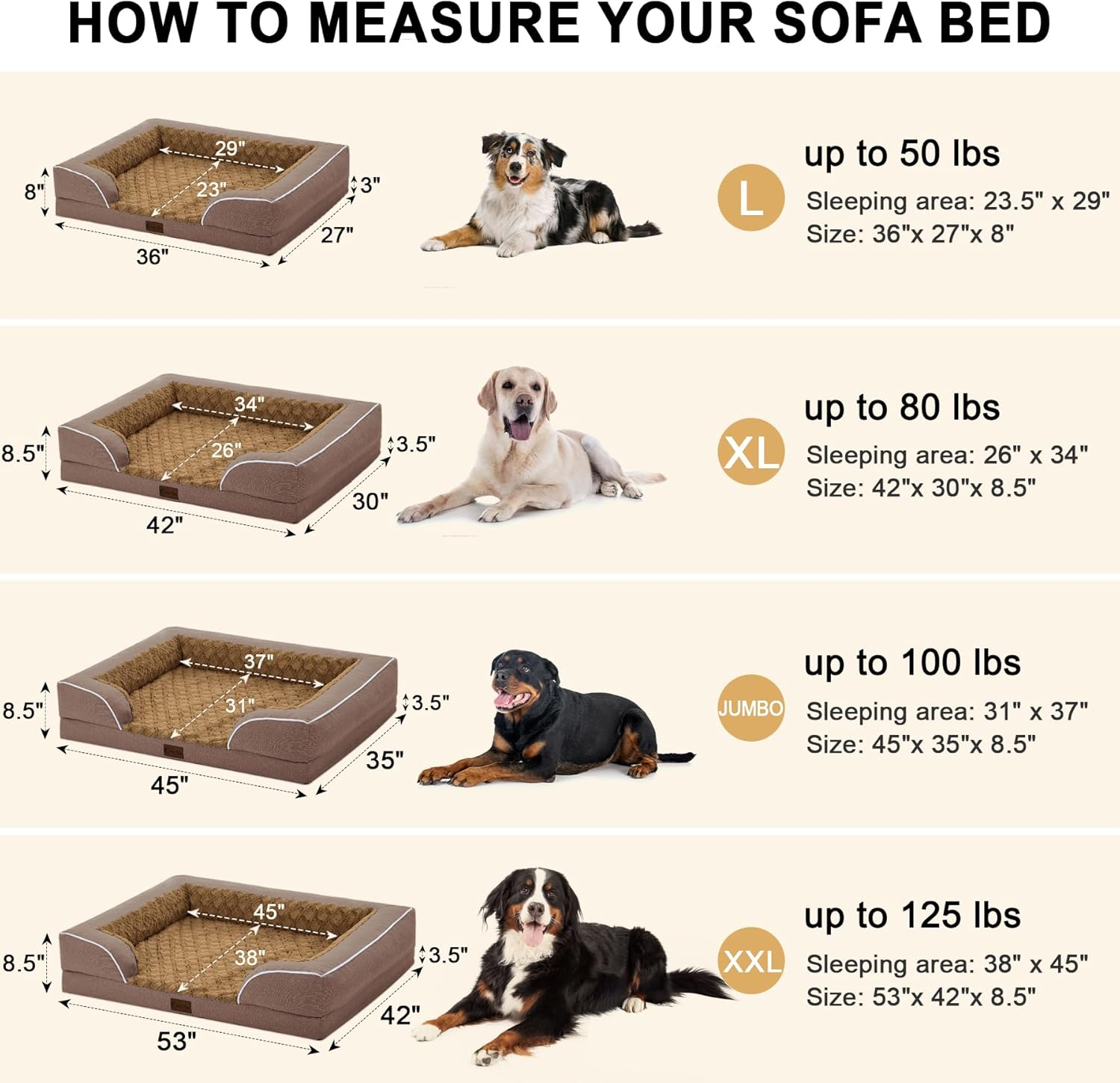 - DOG SOFA SIZE: Large dog beds 36" x 27" x 8"(3" Base+5" Bolster; Sleep Surface: 23.5" x 29")for pets up to 50lbs. Due to the dog couch bed arrives as a vacuum-packed bed in a box, please unpack and leave in air for about 48 hours, the dog bed will spring back and fill up.