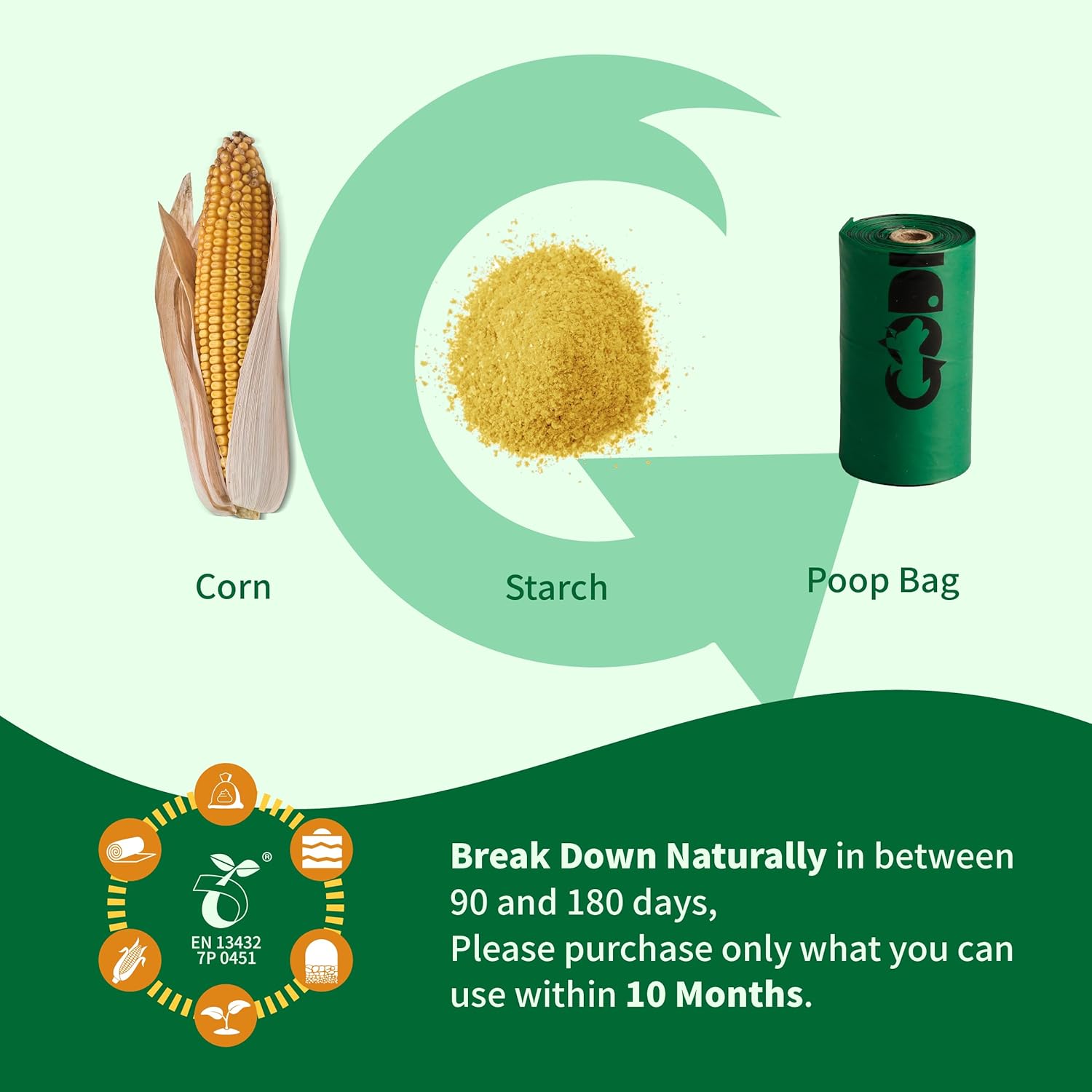 - π± ECO-friendly materials: Codirom dog poop bags are made of corn, vegetable oil, and PBAT (a fully compostable polymer). Keep the bags away from heat sources and store in a cool, dry place. The available time of compostable bags is nearly 12 months, so purchase only that will be used within 10 months.