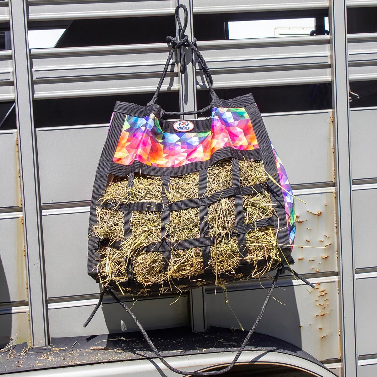 - HOLDS 2-3 FLAKES OF HAY - this 24.5"x9.5"x21.5β hay bag with 3.5" square openings holds approx. 2-3 flakes of Timothy, Orchard, Alfalfa, or any other type of hay. Our hay bags were designed to minimize frustration and can be stuffed in seconds.