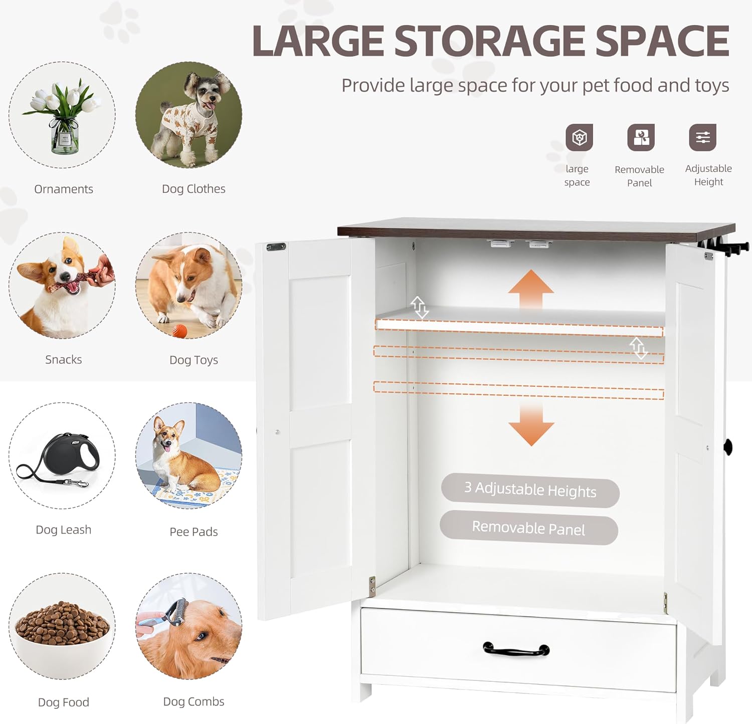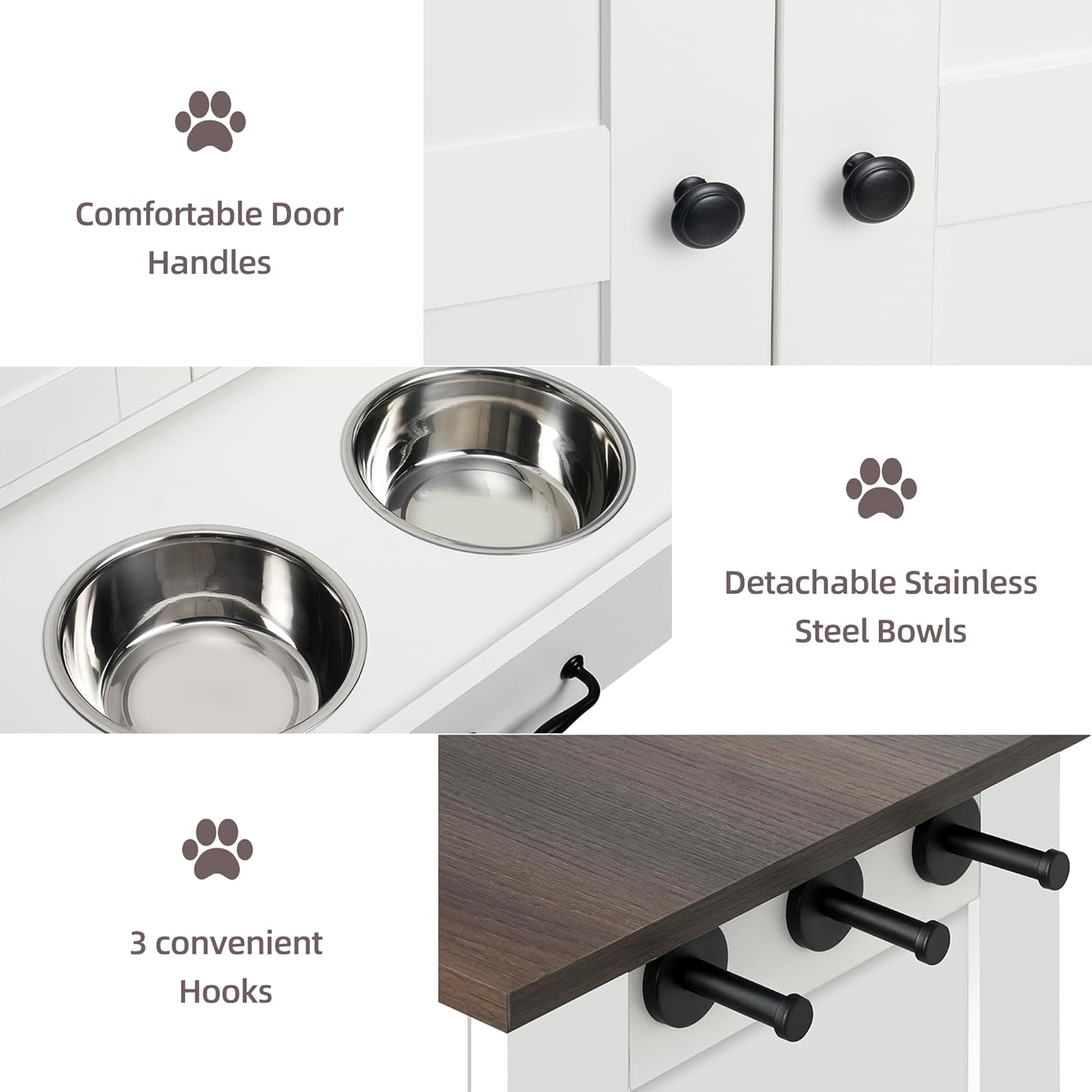 - DETAILED DESIGN: This dog feeding station stands out with its thoughtful detailing, including three hooks on the side for hanging pet collars and leashes. Providing ample storage space for pet supplies, food and toys, you can easily manage your pet's accessories, reduce clutter and keep your living space organised.