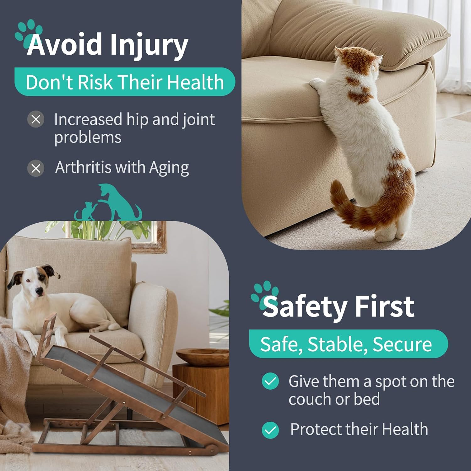 - STURDY & DURABLE: Our pet ramp for dogs and cats is specially made very well - solid wood construction and sturdy stainless steel fasteners, which has been tested to support up to 200lbs. When they jump off the bed, sofa, and sofa, there is no need to worry about getting injured, which provides safety for your pet.